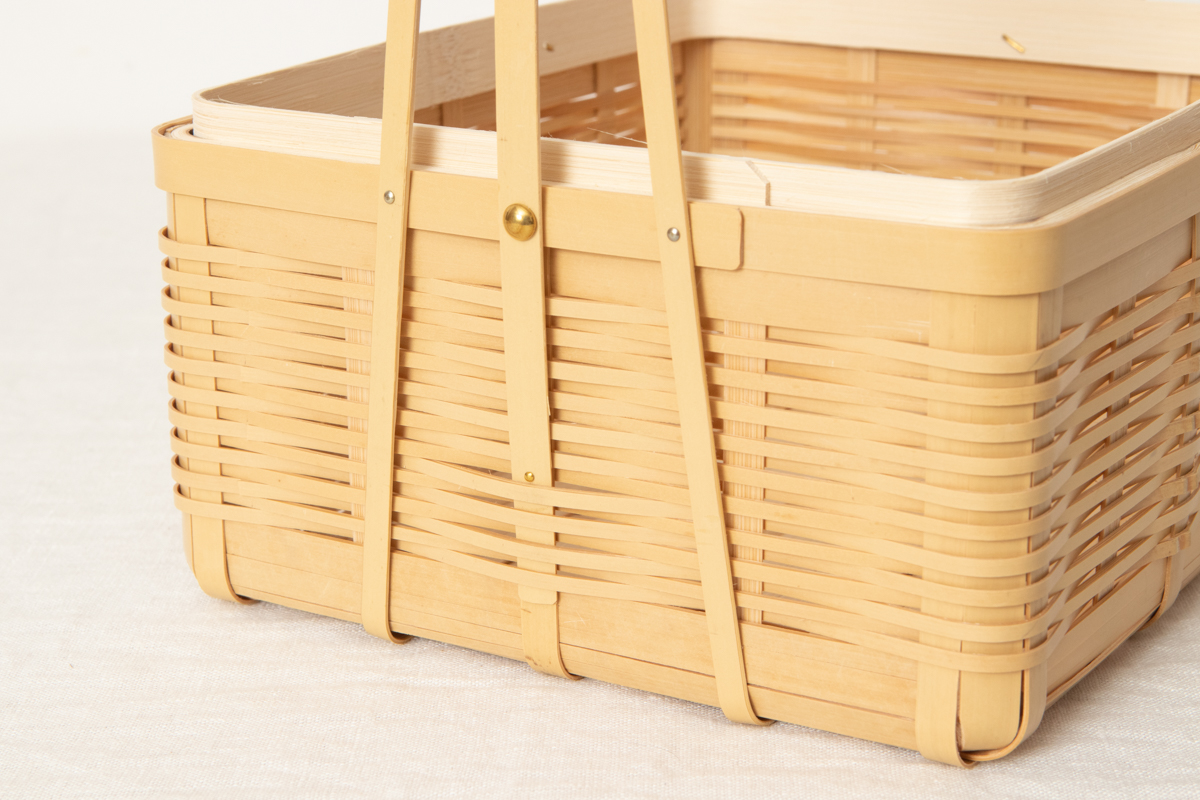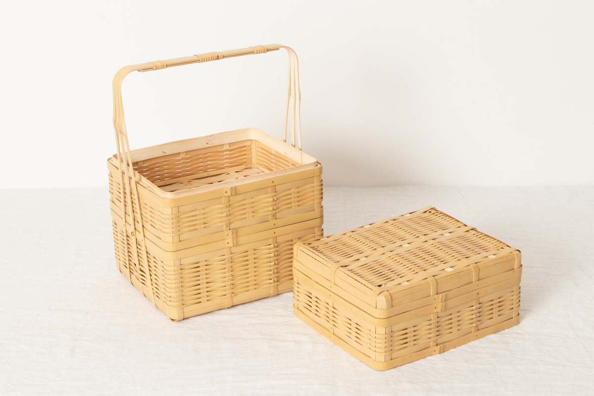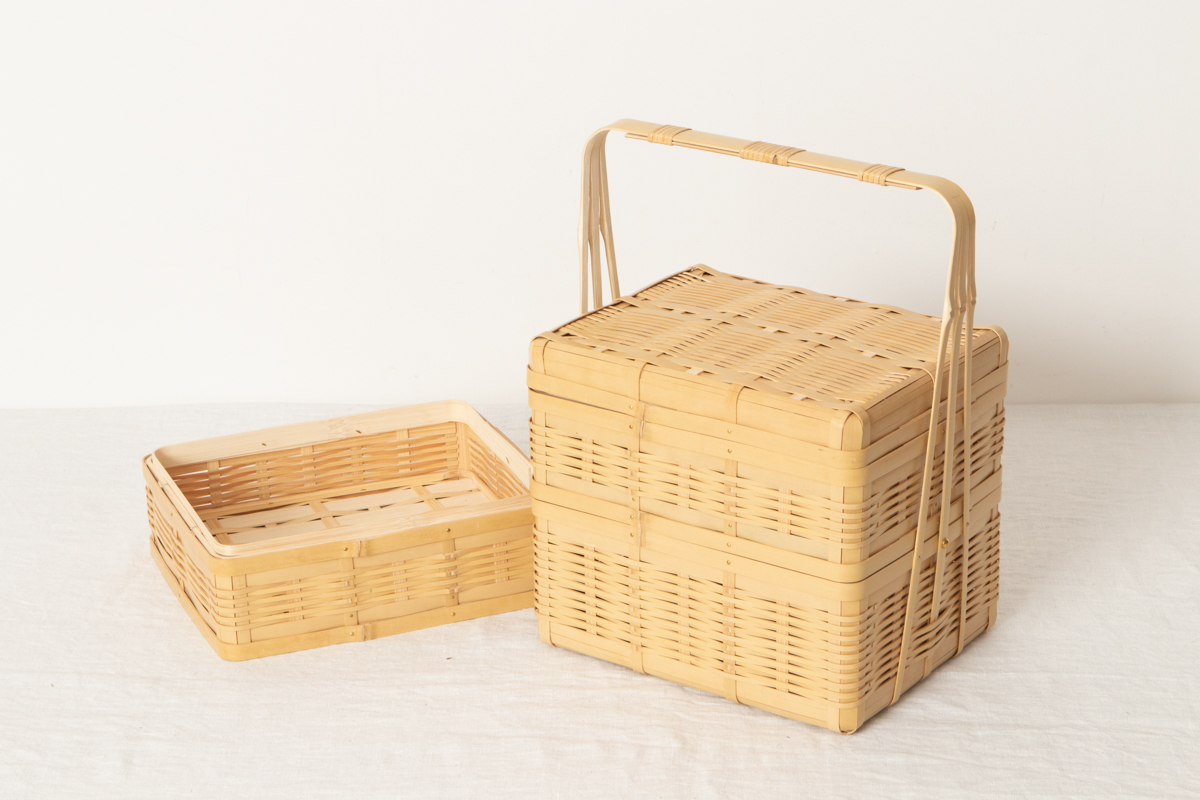 竹の油と色を抜いた「白竹」を使って作られた三段の弁当かごです。