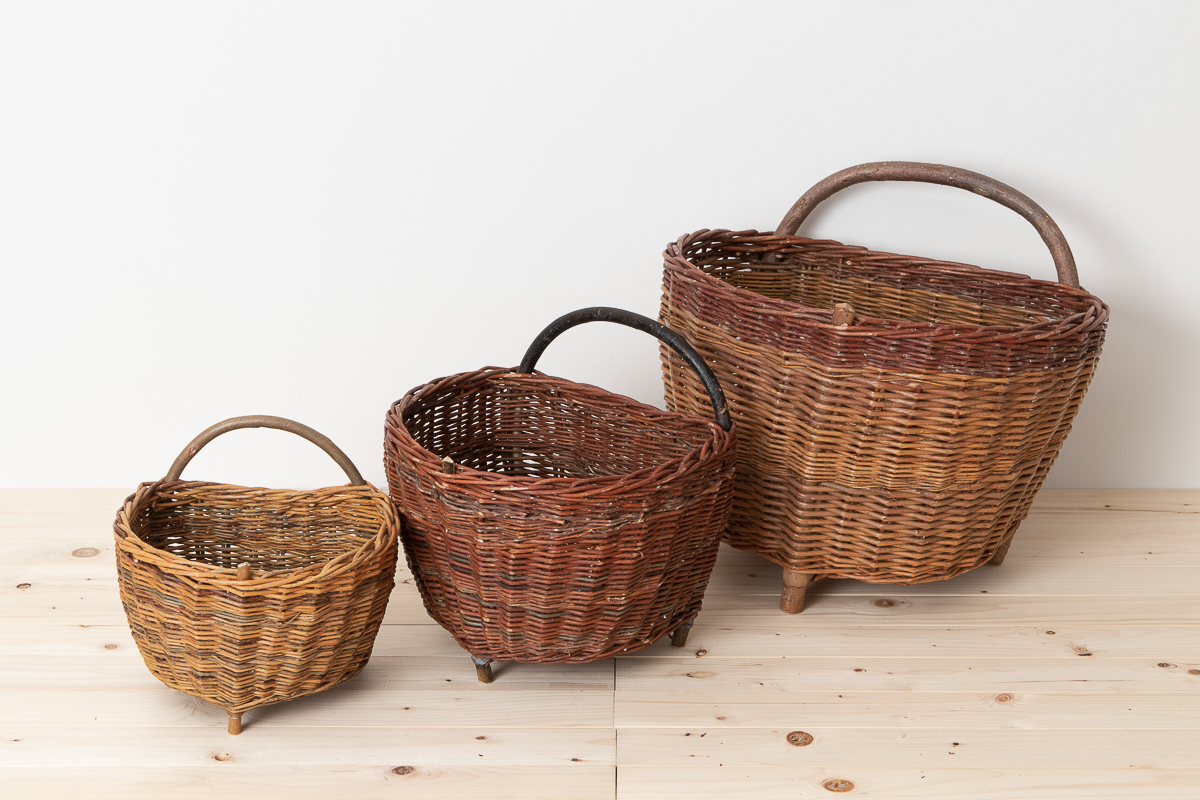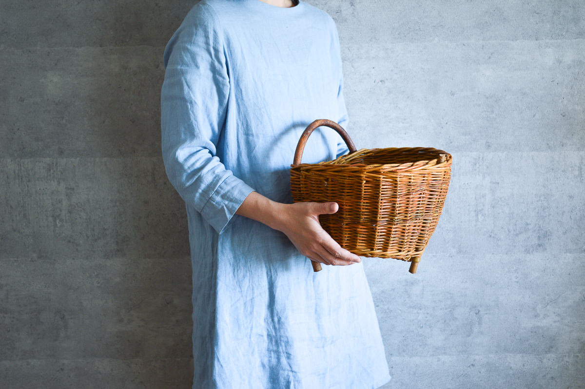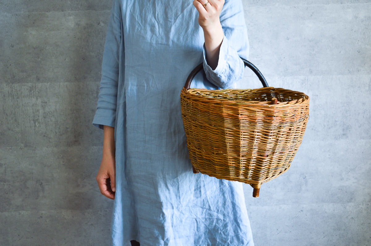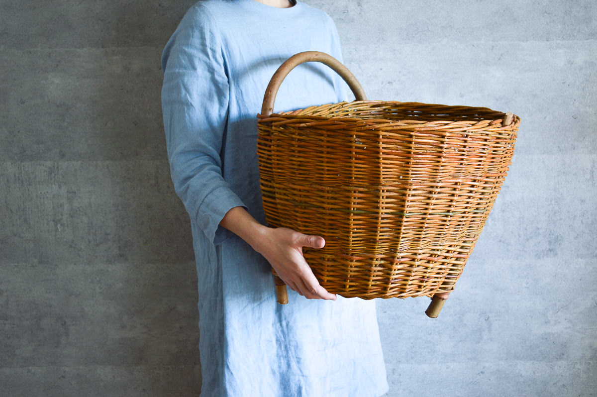 現地の収穫で使うようなかごからしたら、こちらは小さめですが、とはいっても、やはり存在感のある大ぶりなサイズです。ぬいぐるみなどおもちゃ入れや調味料や非常食の備蓄用にも。現地ではじゃがいもの植え付けや収穫、りんごのピッキングのときには