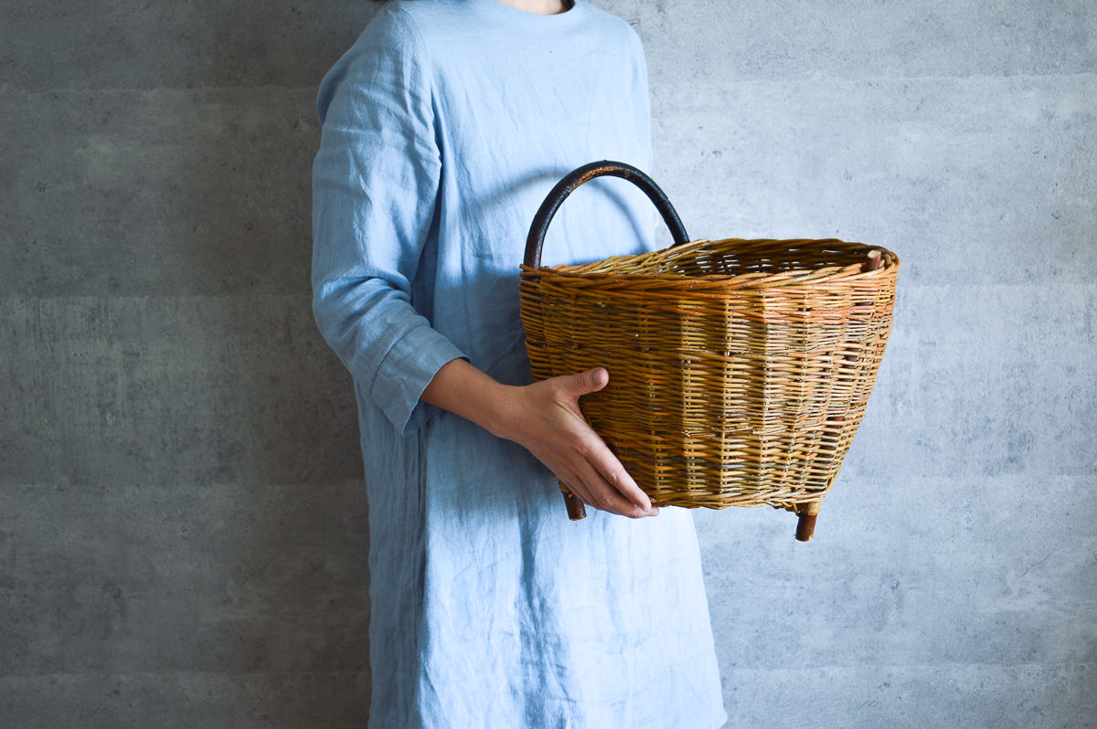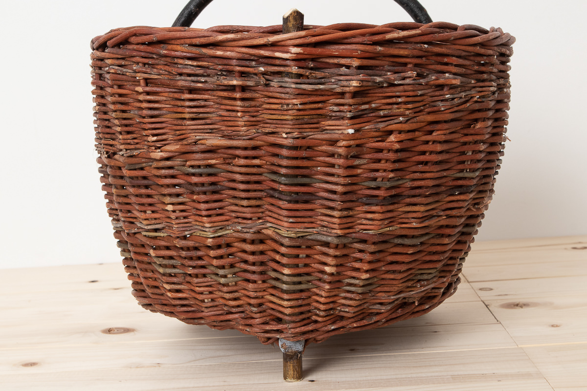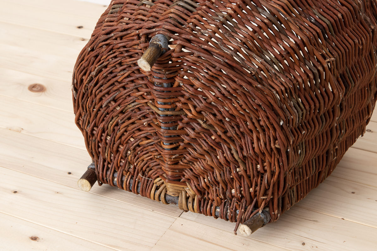 取手は同時に2本の後ろ足にもなっています。かご前面に通されたもう1本のやなぎが前足となっています。この3本足も特徴的です。