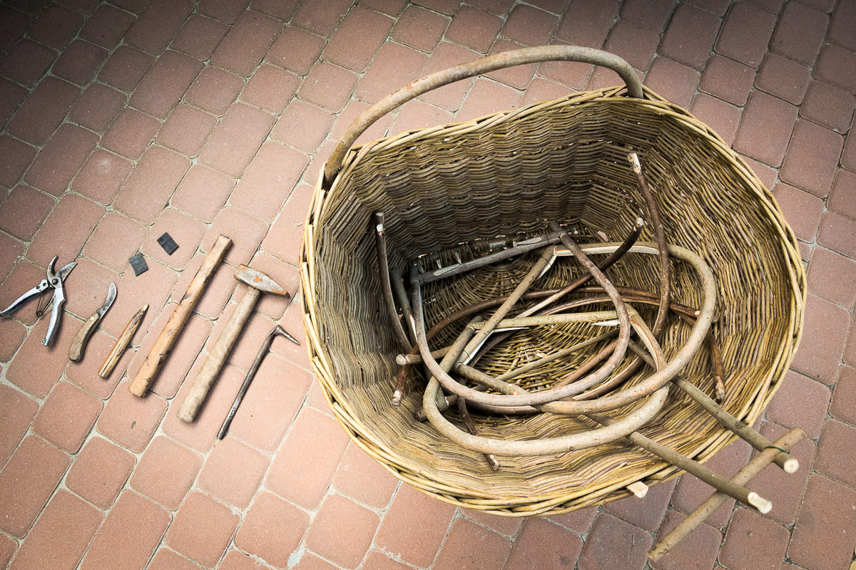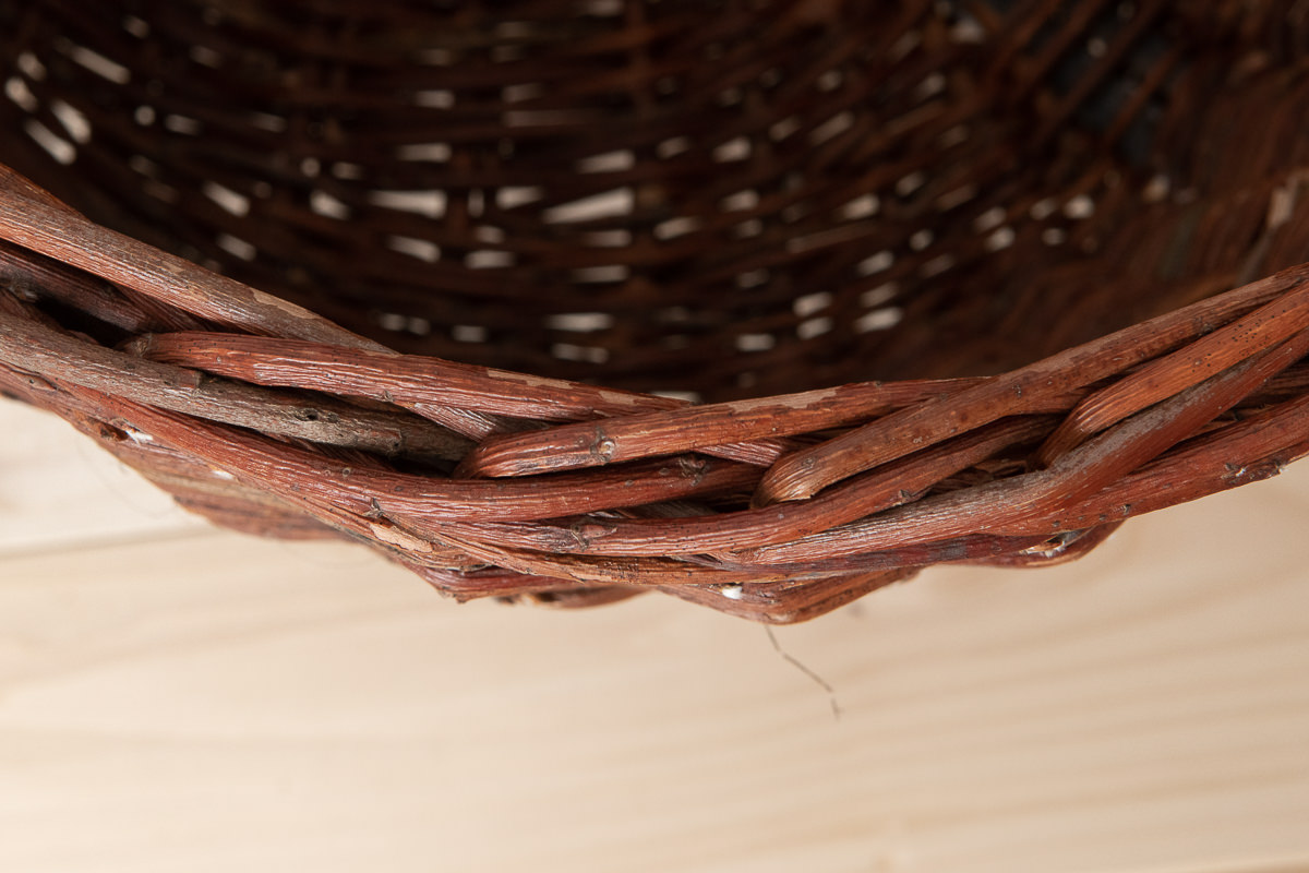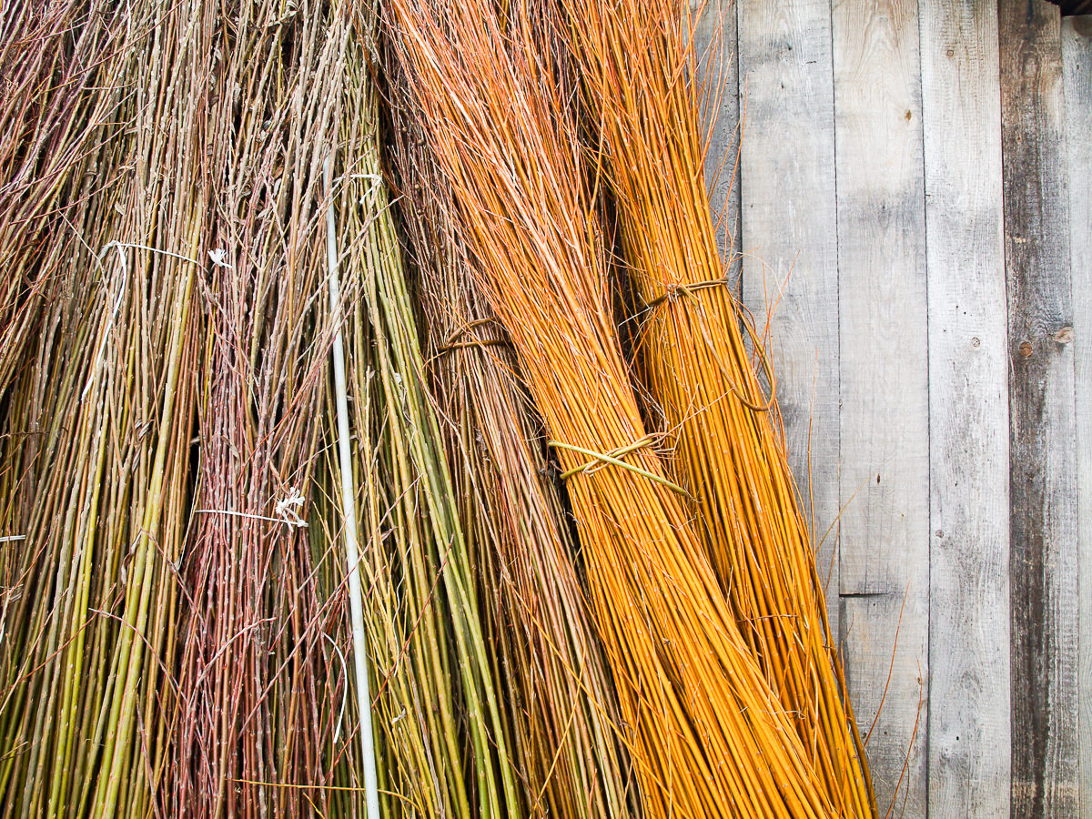 やなぎは自家栽培のものや、ヴィスワ川沿岸に自生しているものを採取し、樹皮が付いたままの枝を使って編んでいます。編むのは主に冬の仕事です。採れたてのものは鮮やかなグリーンだったり、黄色がかっていたりしますが、それほど時間を経ずに、このように茶色や赤味がかった色へと変化します。やなぎは枝の先に行くにつれて細くなっているため、かごの側面にも枝の太い部分と細い部分が見られます。