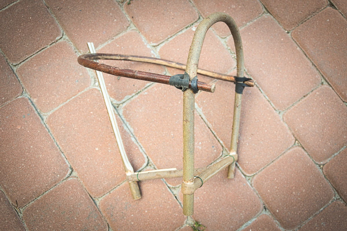 こちらは品名の由来ともなっている「カヴォンク」(弓)と名付けられた取手です。収穫で使うときには、弓形の取手を腕にかけたり、大きいサイズは肩にかけたりして使っているそうです。