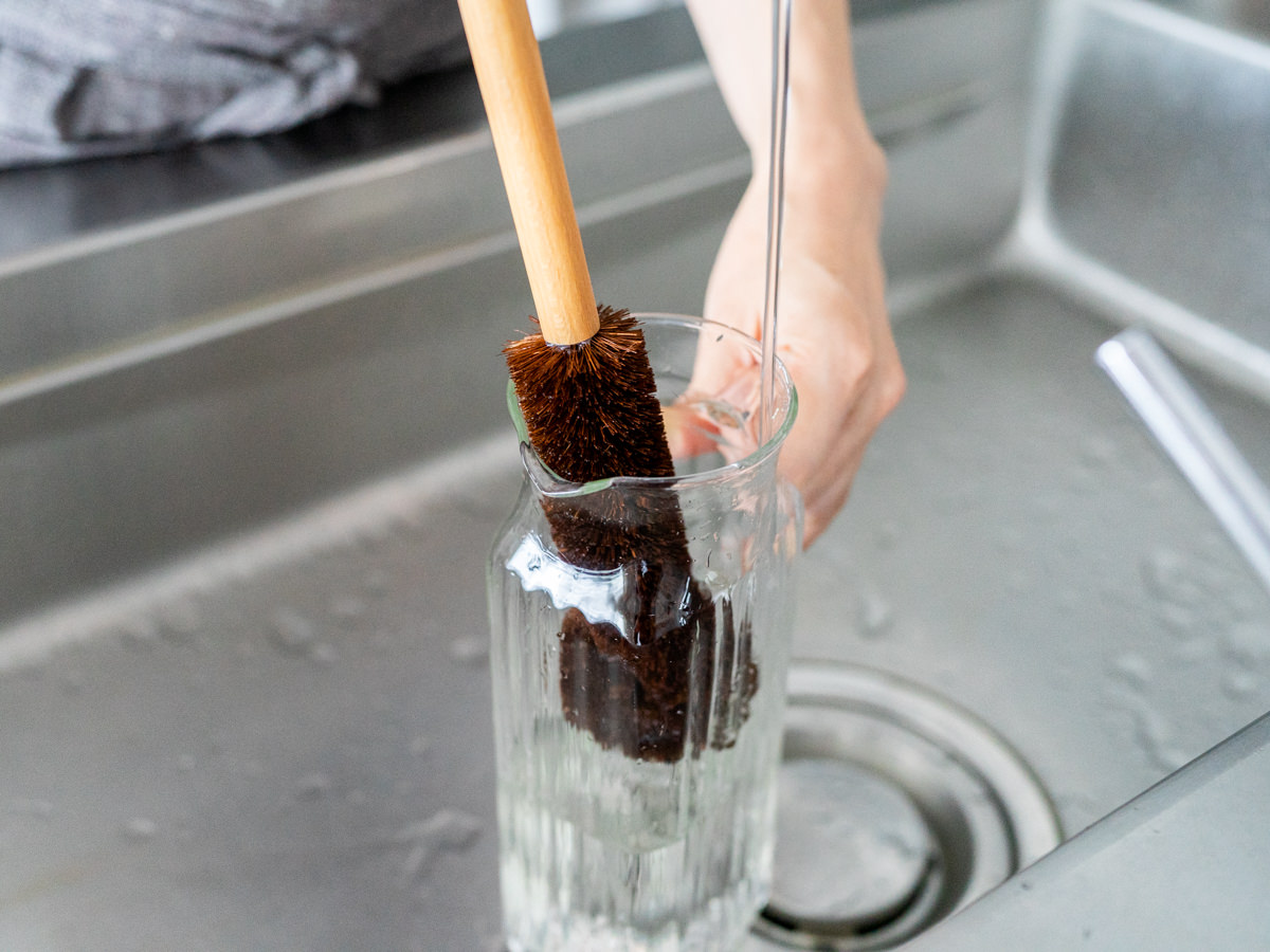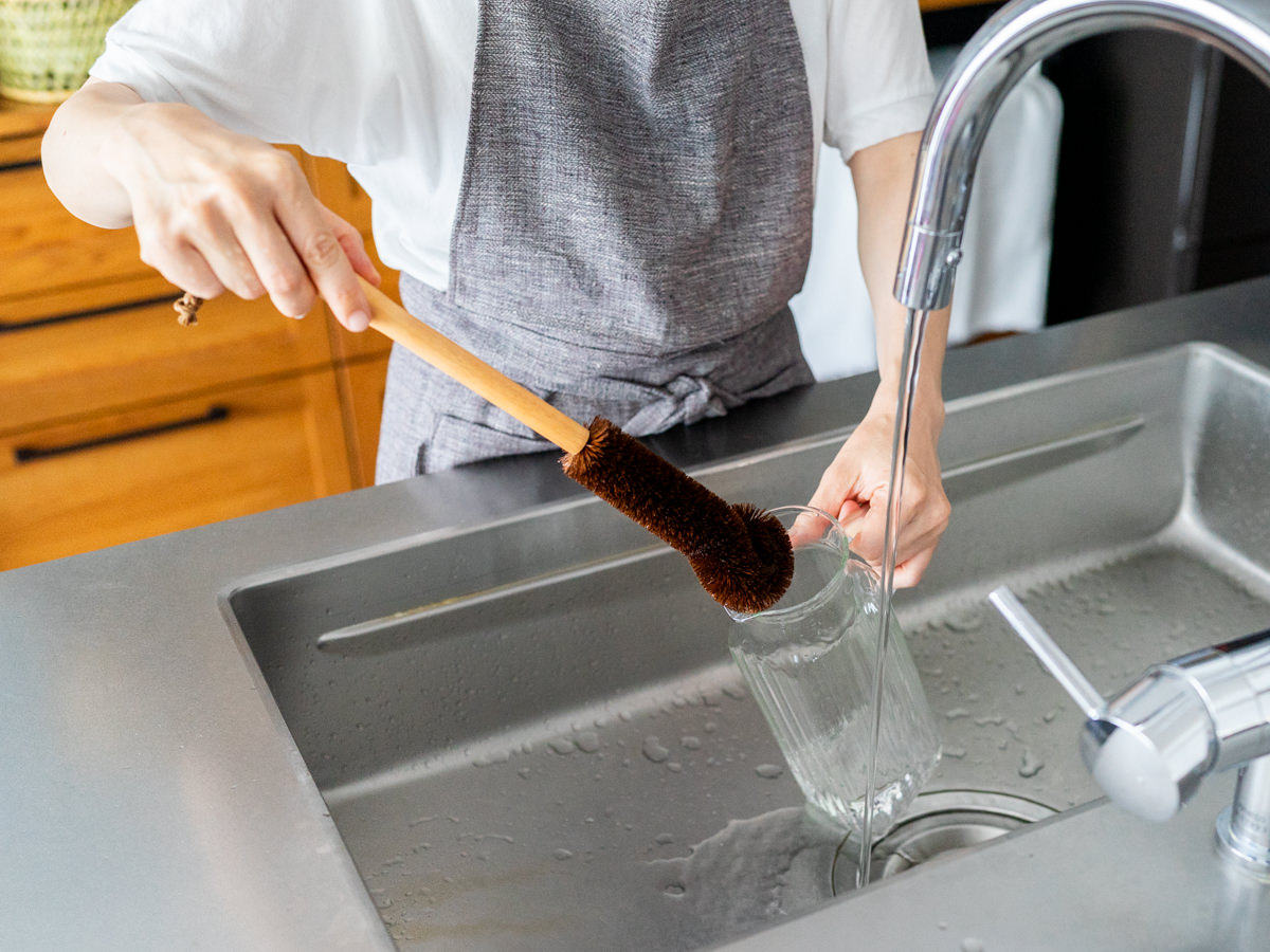 注ぎ口の部分はたわしの細い部分をつかって、こすることができます。つかい終わったら、ちゃっちゃっと水をよく切り、吊るしたり、水切りラックなどに置くなどして保管してください。