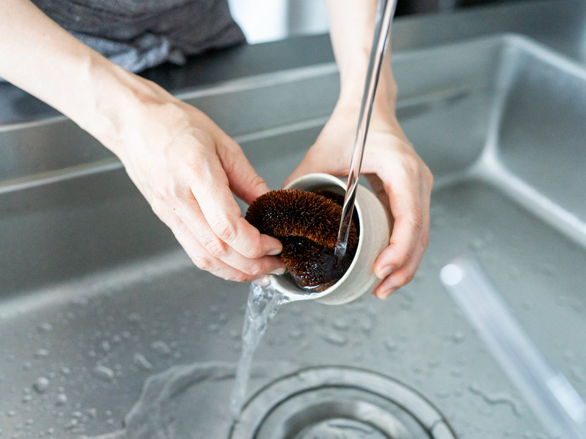 天然のしゅろで作られたたわしは、繊維にほどよいかたさとしなやかさがあり、ガラスのうつわやコップ、テフロン加工のフライパンや鍋など、傷つけたくない道具にも安心しておつかいいただけます。