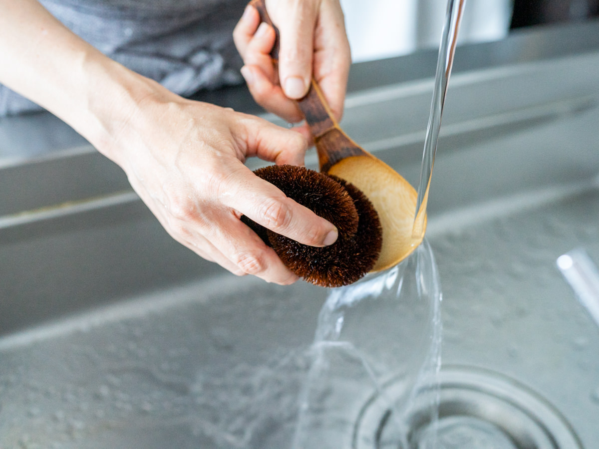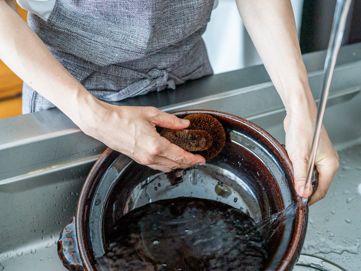 土鍋の底や縁もしっかりとあらうことができます。つかい終わったら、先端にはさまった汚れをとりのぞき、