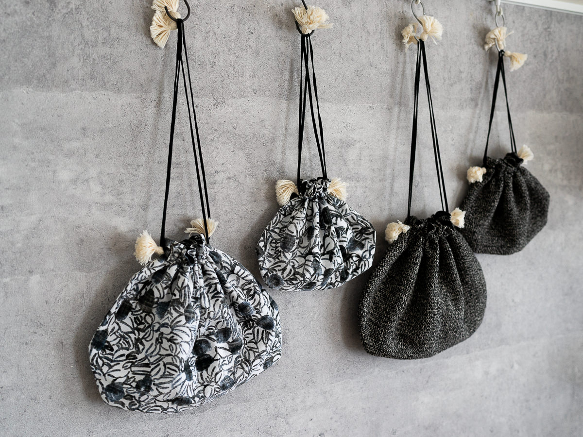 通常1本ずつで織っていくところ、こちらはたて糸を2本、よこ糸を2本引きそろえて織られた、“OX(オックス)”という、平織りの生地がつかわれています。ブラックの裏地つきです。プリントは、“捺染(なっせん)”とよばれる、直接布に染めつけていく技法で染められています。手作業で、力をこめて捺染することで、生地の裏にまでしっかりと色と柄が浸透します。こちらはその生地裏を、あえて表にしてつくられたもの。色の濃淡や、かすれた部分など、ひとつひとつ表情がちがうのも魅力です。紐の先端にはフリンジつき。ふんわりとしたアイボリーの色味がかわいらしく、全体のアクセントに。こちらはSサイズです。化粧品やハンドクリーム入れに、ポーチとして。スマホと財布、リップを入れてミニマムなおでかけにも。こちらはLサイズです。横幅があり、見た目以上に容量があります。財布やポーチにくわえて、文庫本も入るサイズ。ポーチやミニバッグとしてはもちろん、かごバッグや手提げのバッグインバッグにも。 植物のモチーフ柄やフリンジが、かごからちょこっとのぞくのも、かわいらしいです。写真右:シルク×コットン Drawstring Bag Monochrome