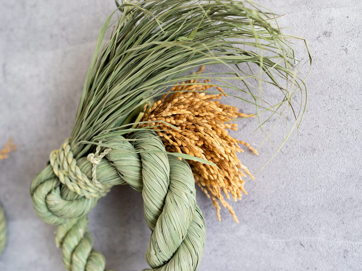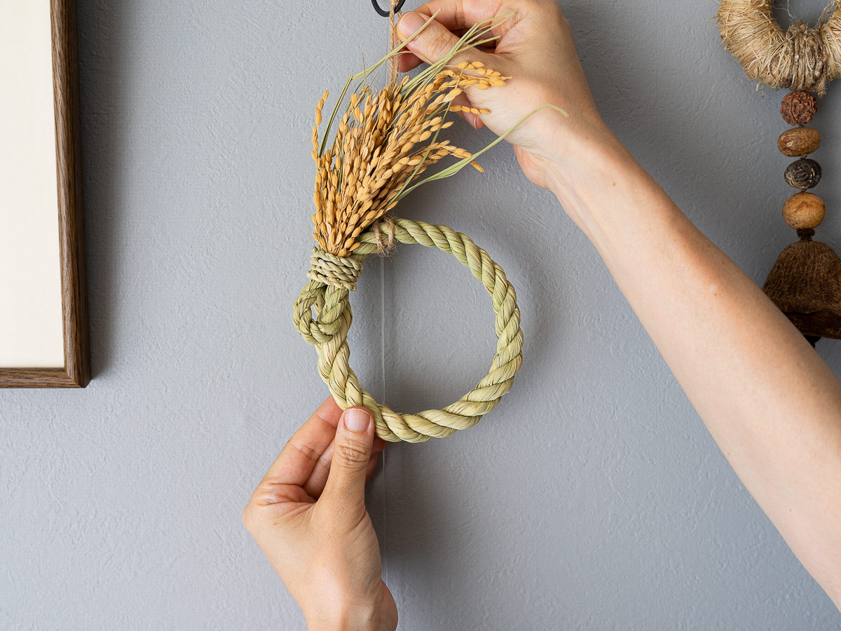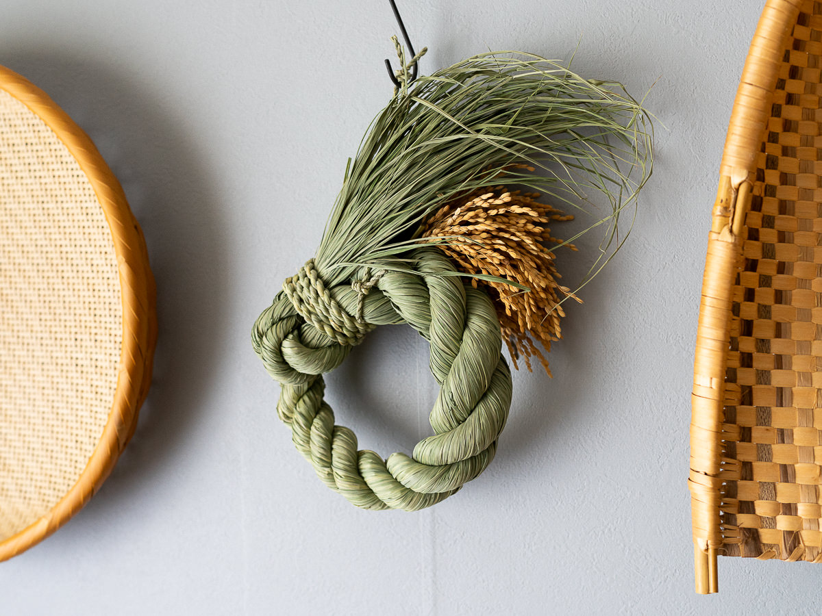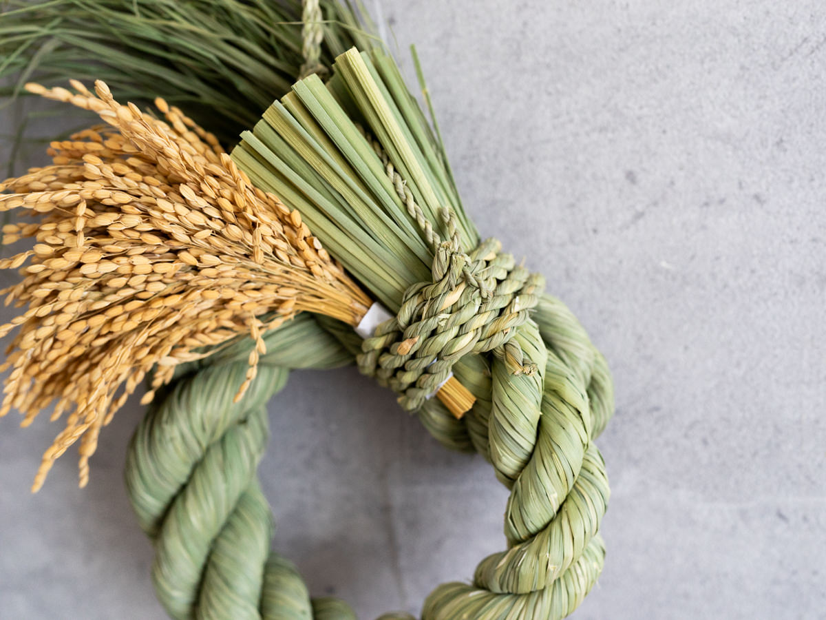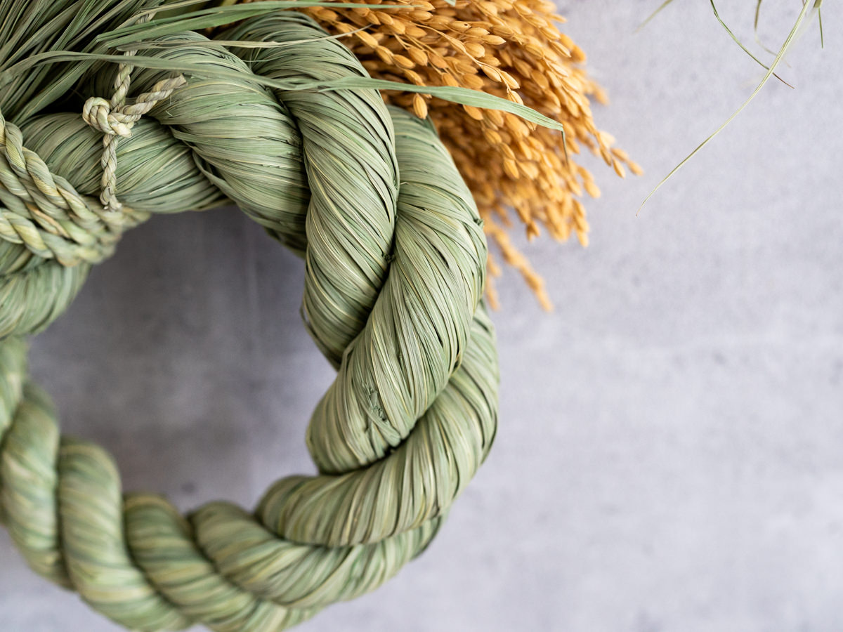 クリスマスのリースのような、まるい輪のかたちは、稲わらを束ねて縄のように綯-な-われた“一本のしめ縄”からつくられています。