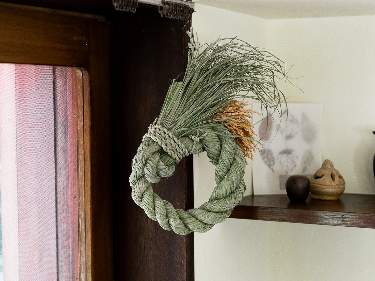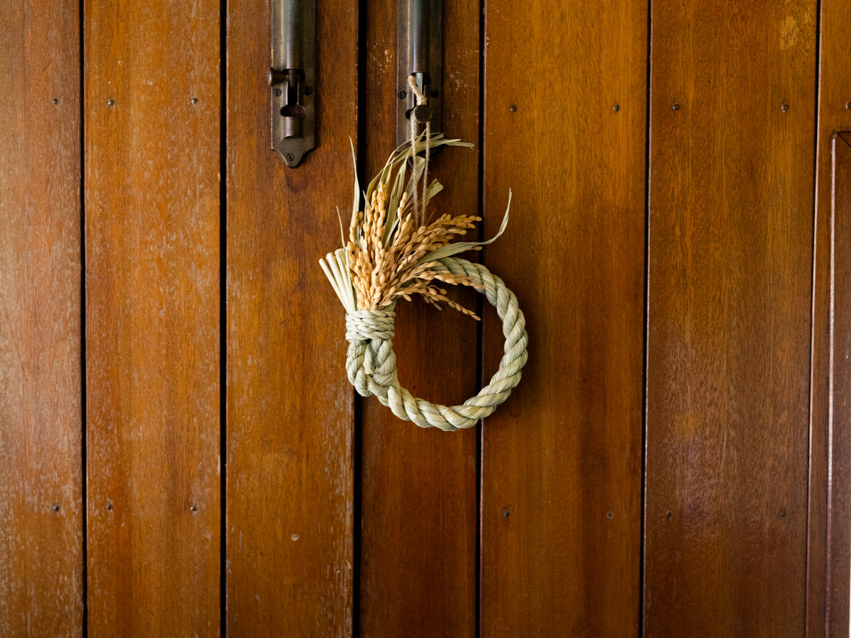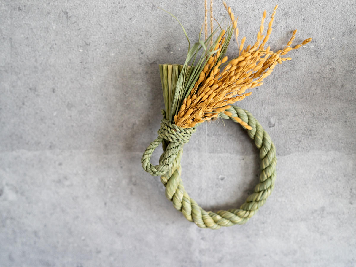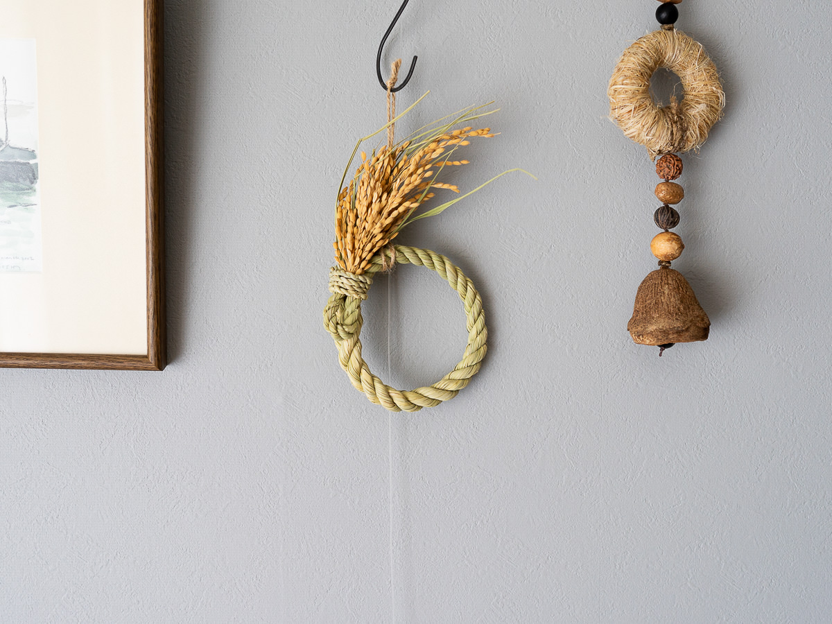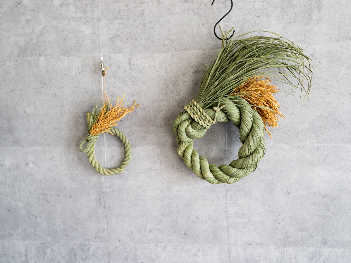 クリスマスのリースのような、まるい輪のかたちは、稲わらを束ねて縄のように綯-な-われた“一本のしめ縄”からつくられています。