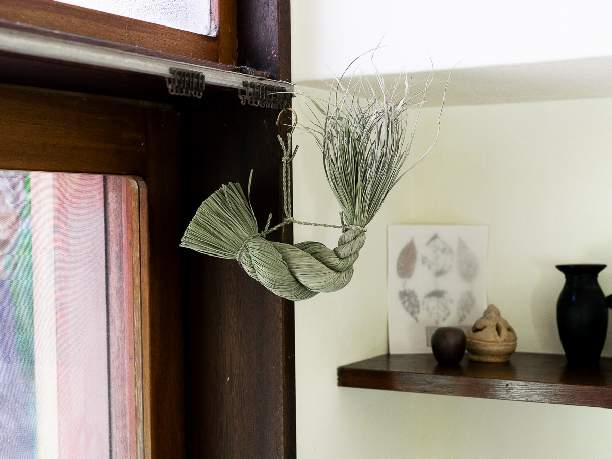 つるしてかざるための縄ひもつき。バランスよくつるせるよう、工夫されています。