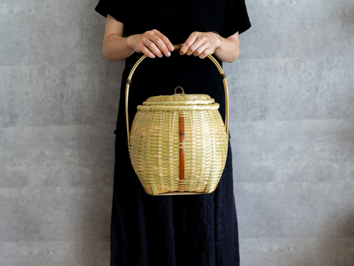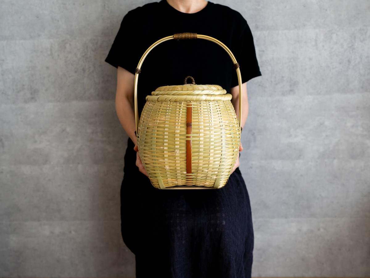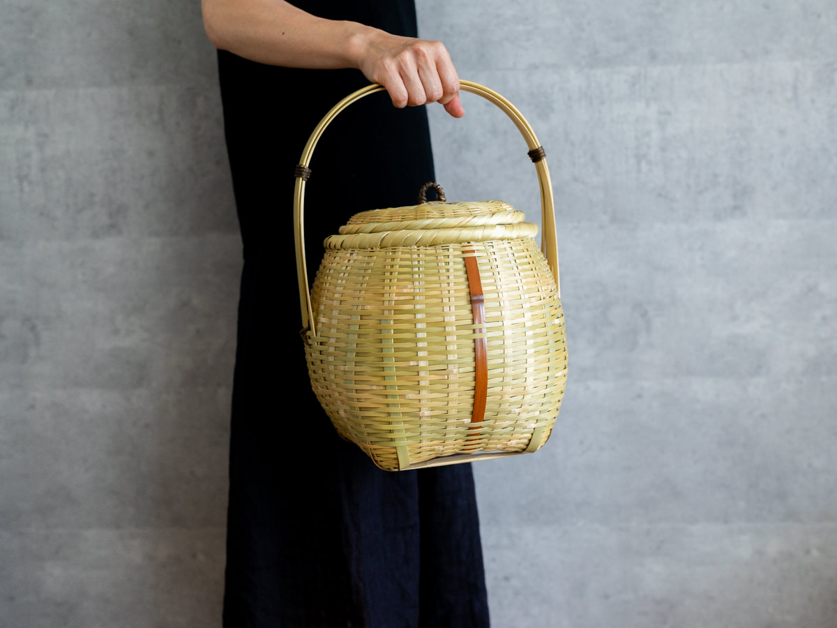 こちらは「青竹-あおたけ-」に“みがき”をかけたひごで、編まれた蓋付きのバスケットです。