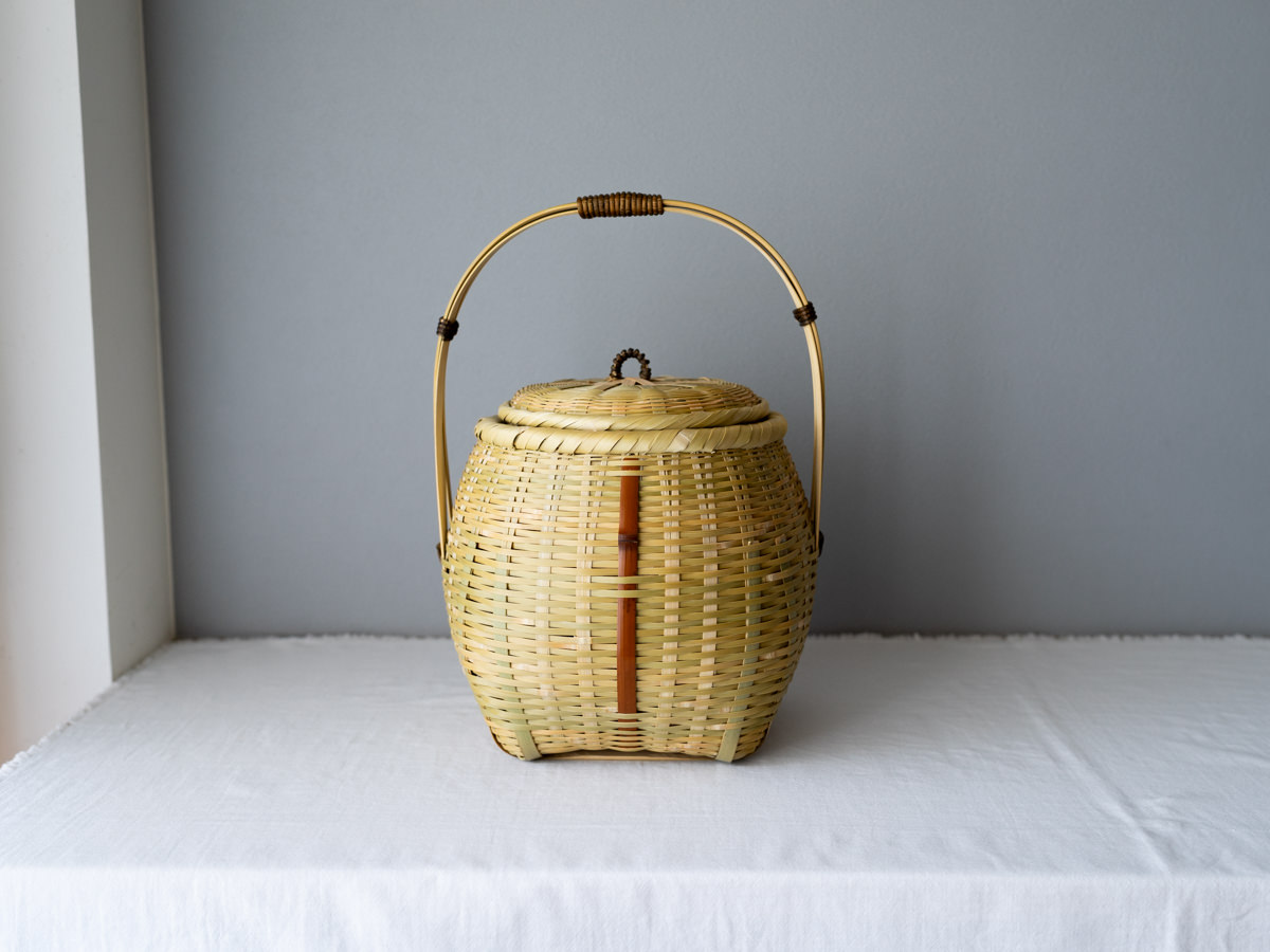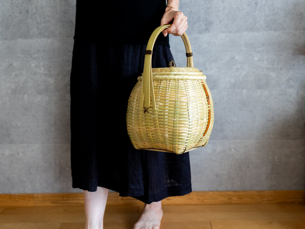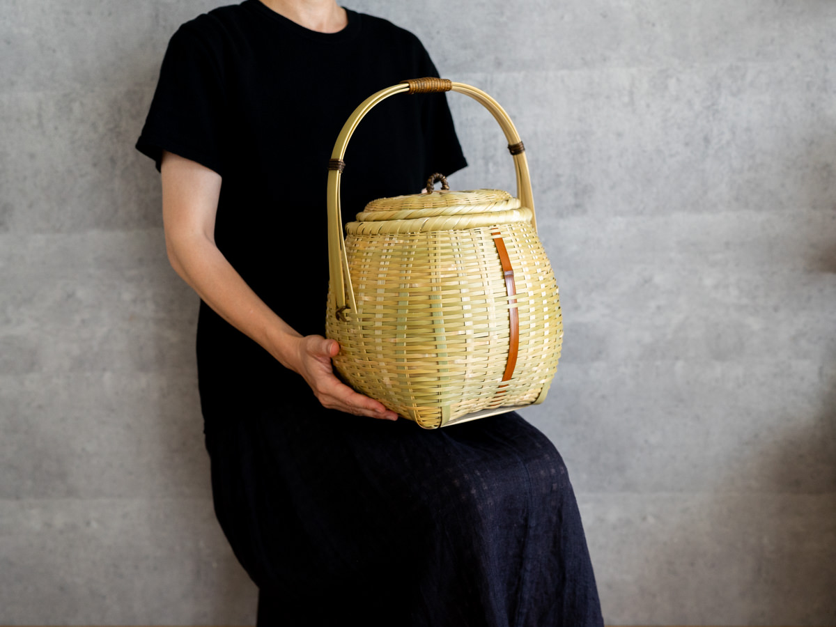 こちらは「青竹-あおたけ-」に“みがき”をかけたひごで、編まれた蓋付きのバスケットです。