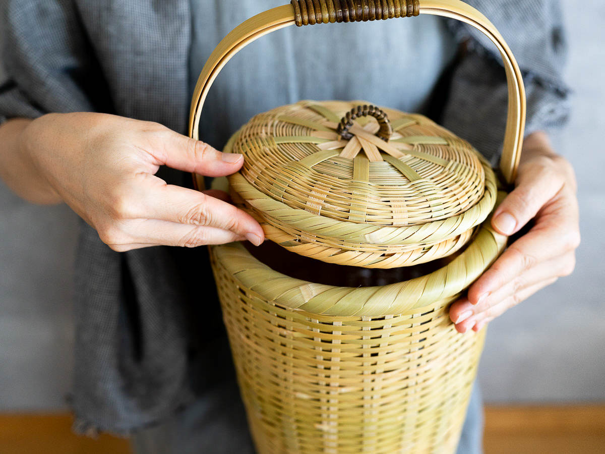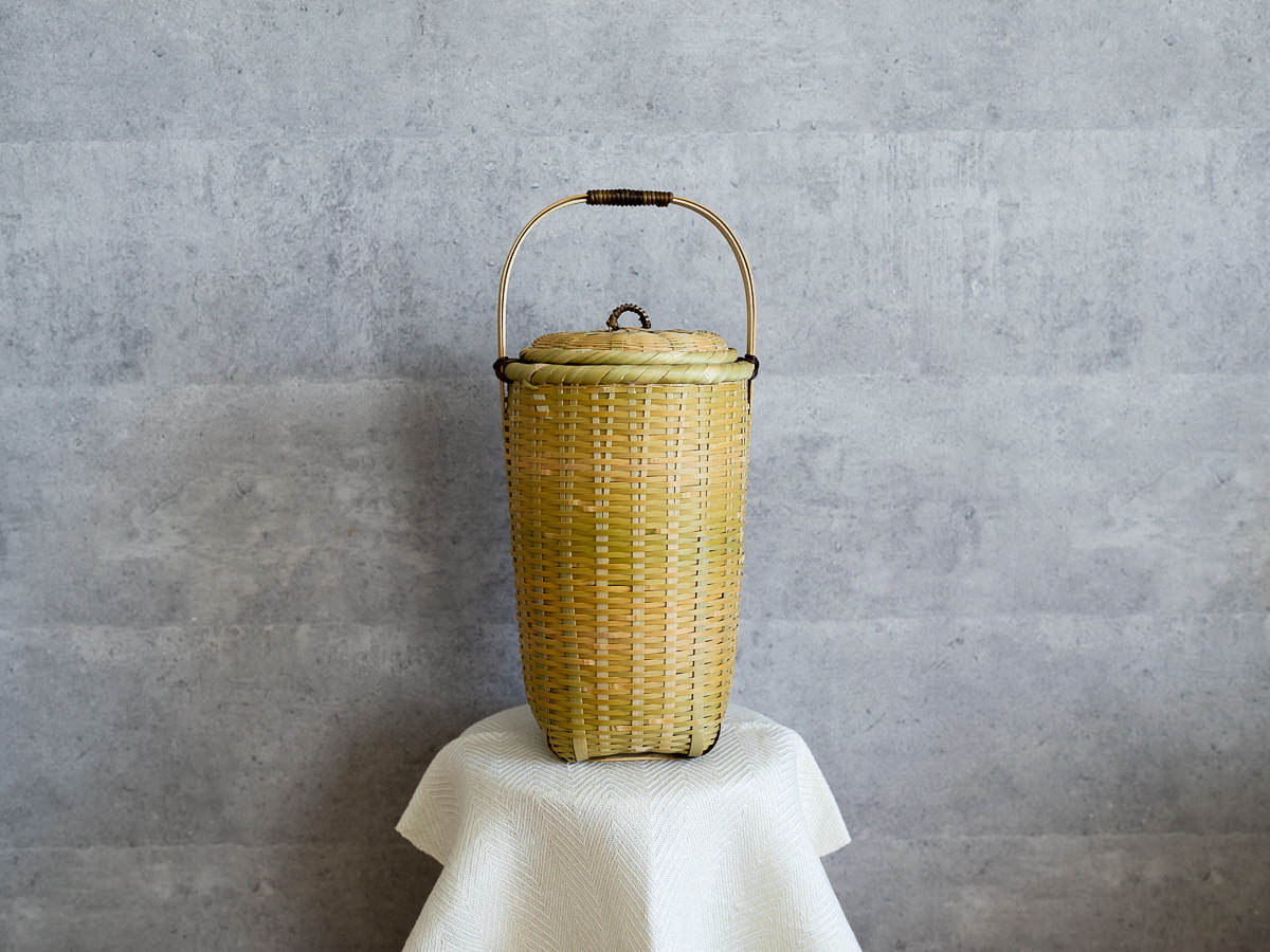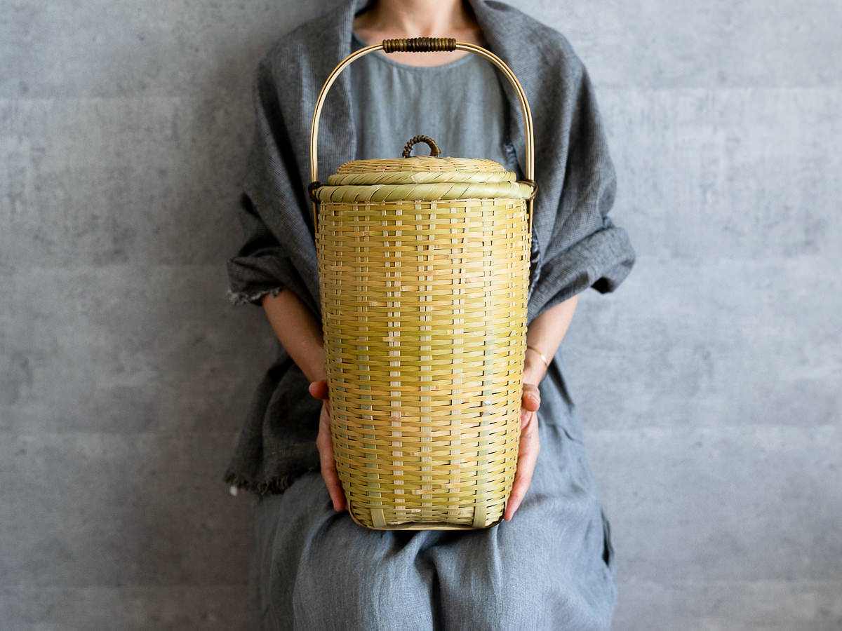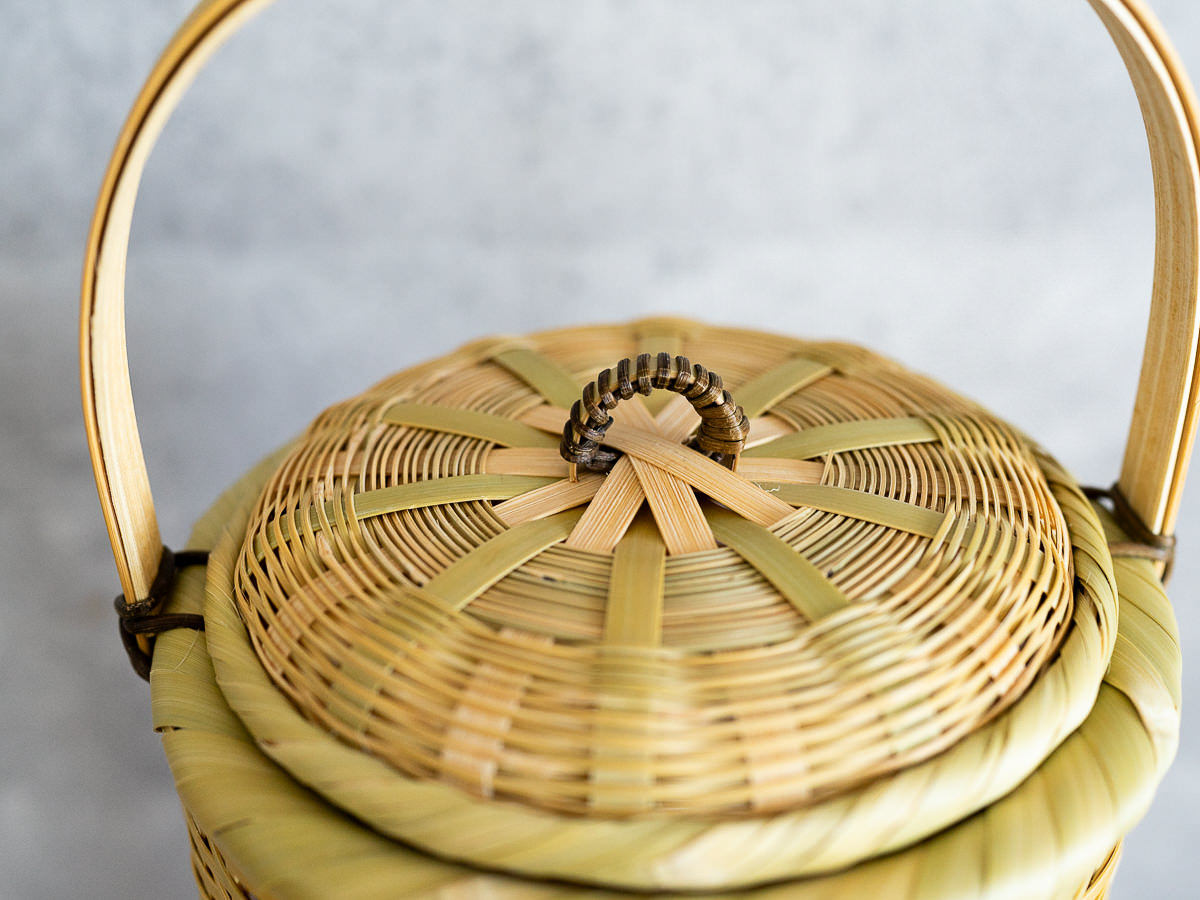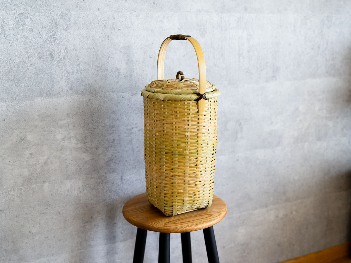 こちらは「青竹-あおたけ-」に“みがき”をかけたひごで、編まれた蓋付きのバスケットです。