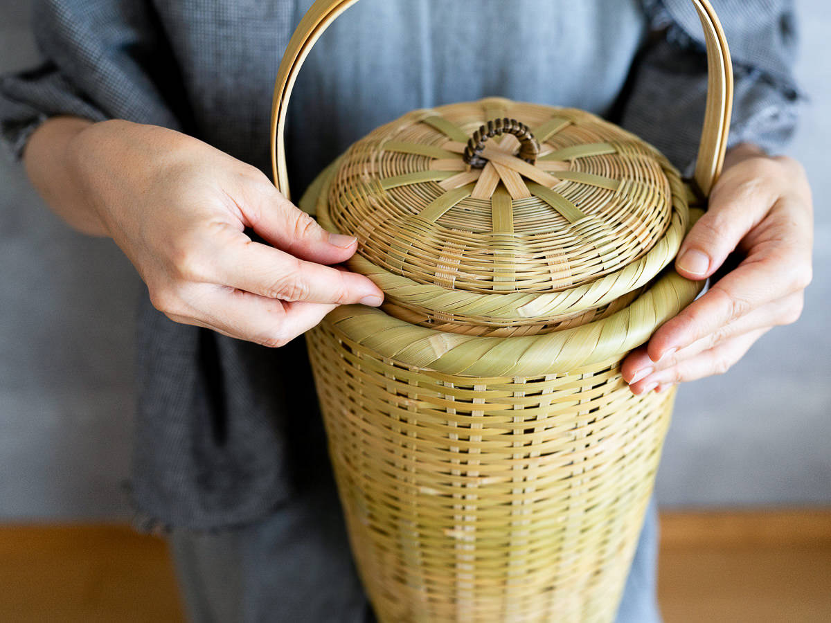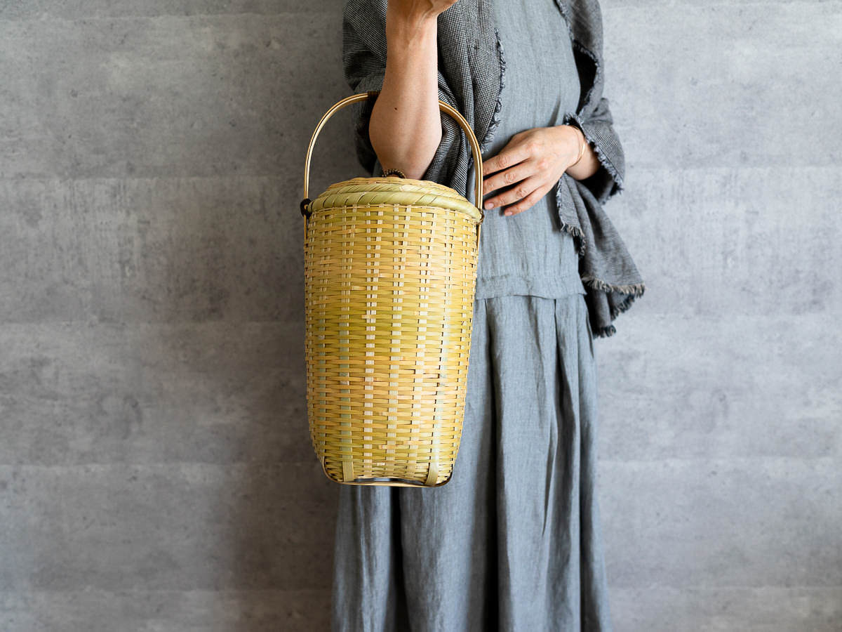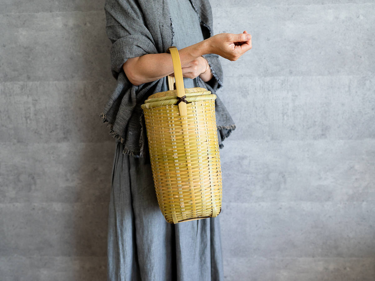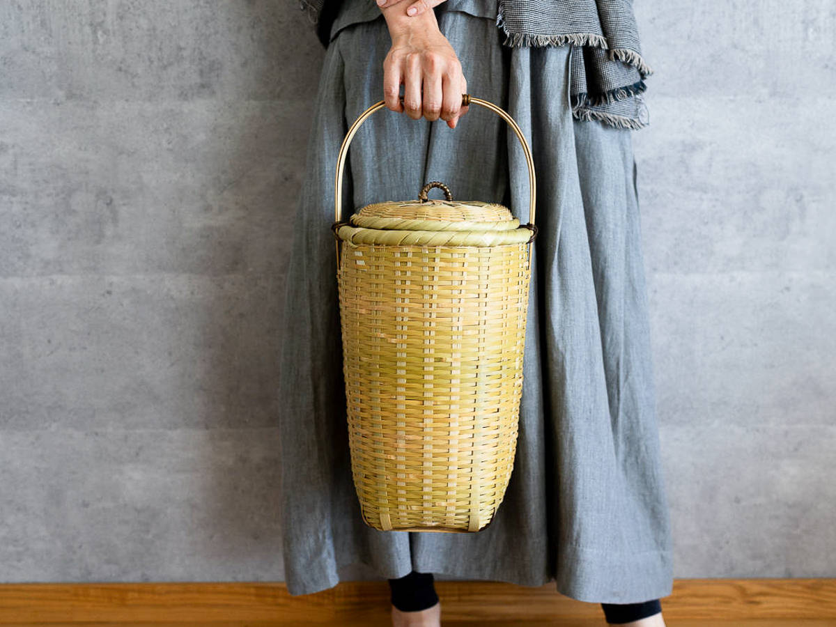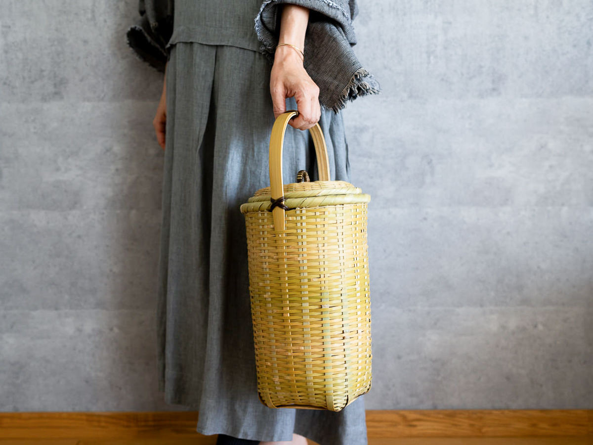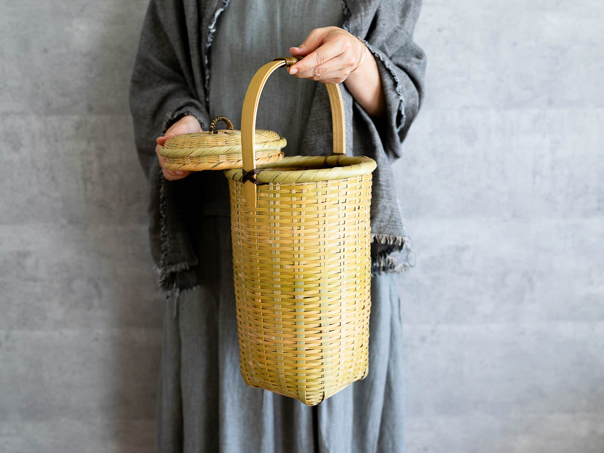 こちらは「青竹-あおたけ-」に“みがき”をかけたひごで、編まれた蓋付きのバスケットです。