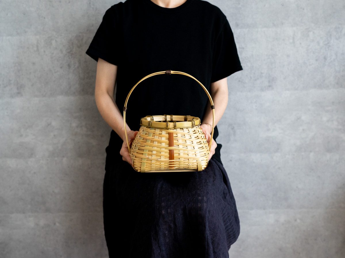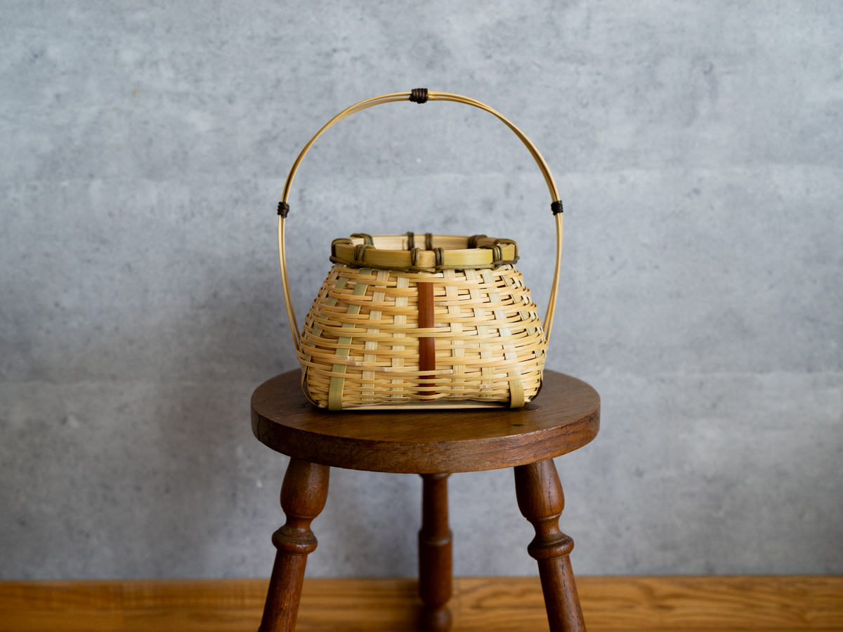 一本一本みがかれたひごで、丁寧に、そして力強く、そしてときにやわらかく編まれています。かごのどこに触れても、竹はささくれ立つものということをわすれてしまうほどの滑らかさです。正面の編み目の真ん中には、茶色い煤竹-すすたけ-が刺さっており、アクセントになっています。