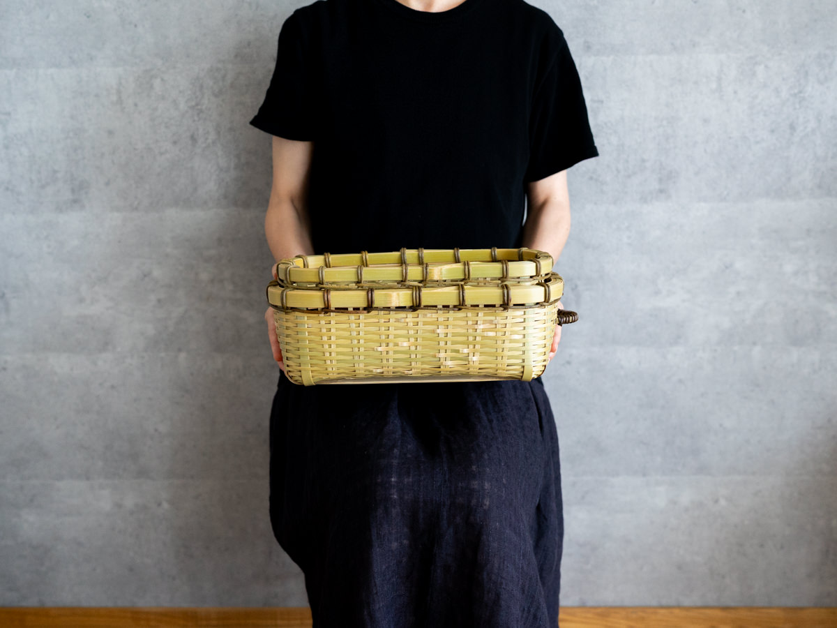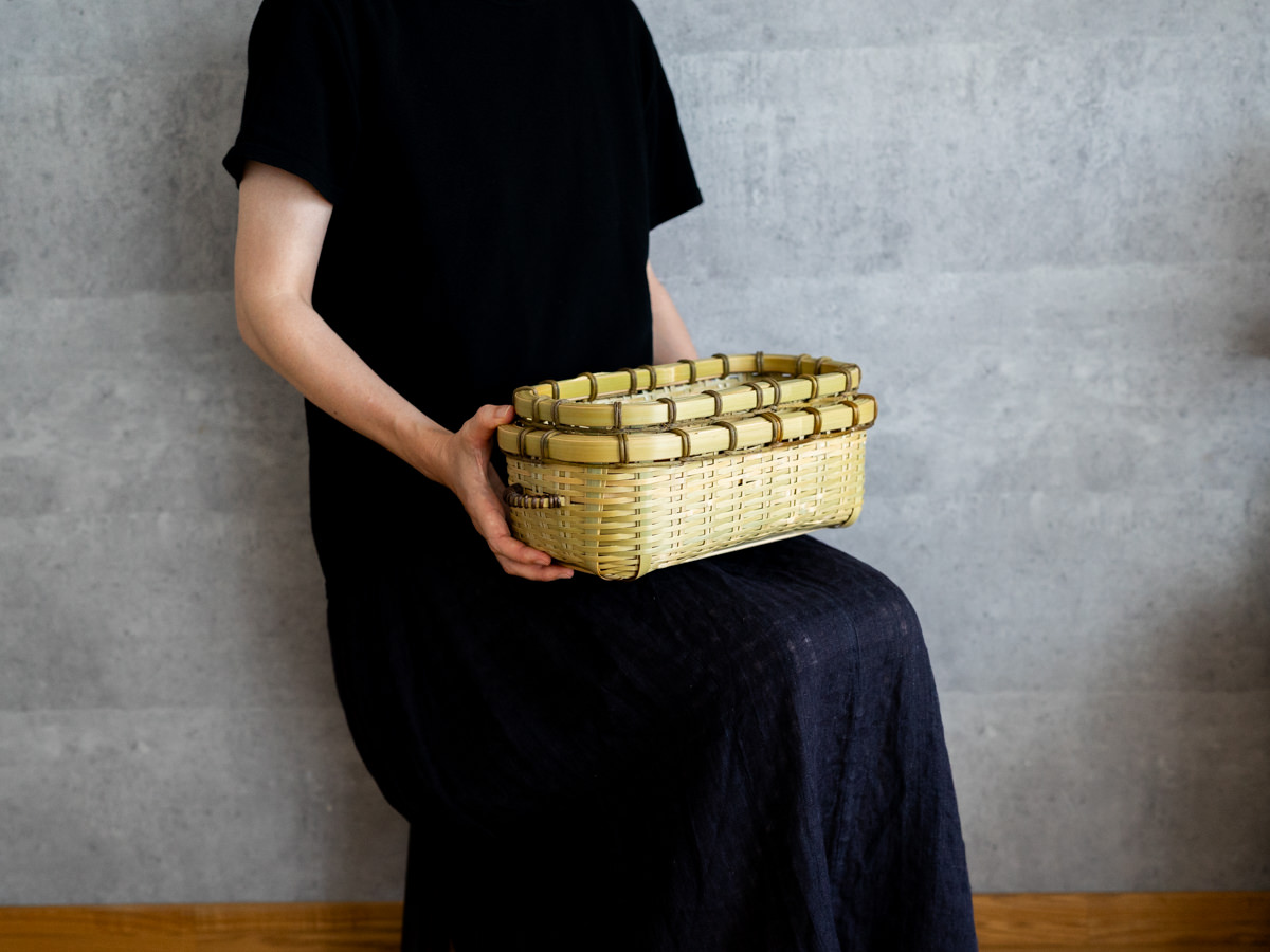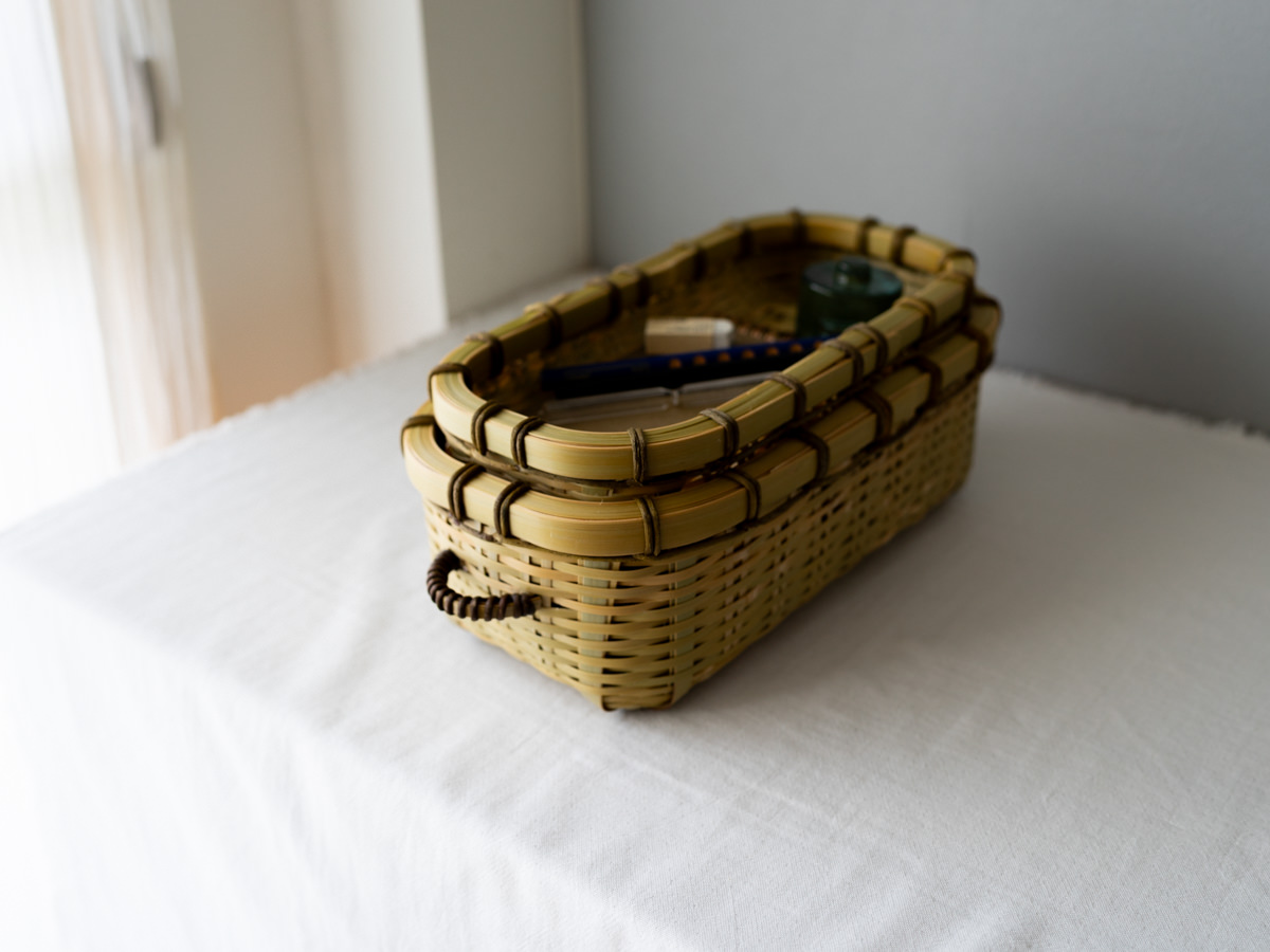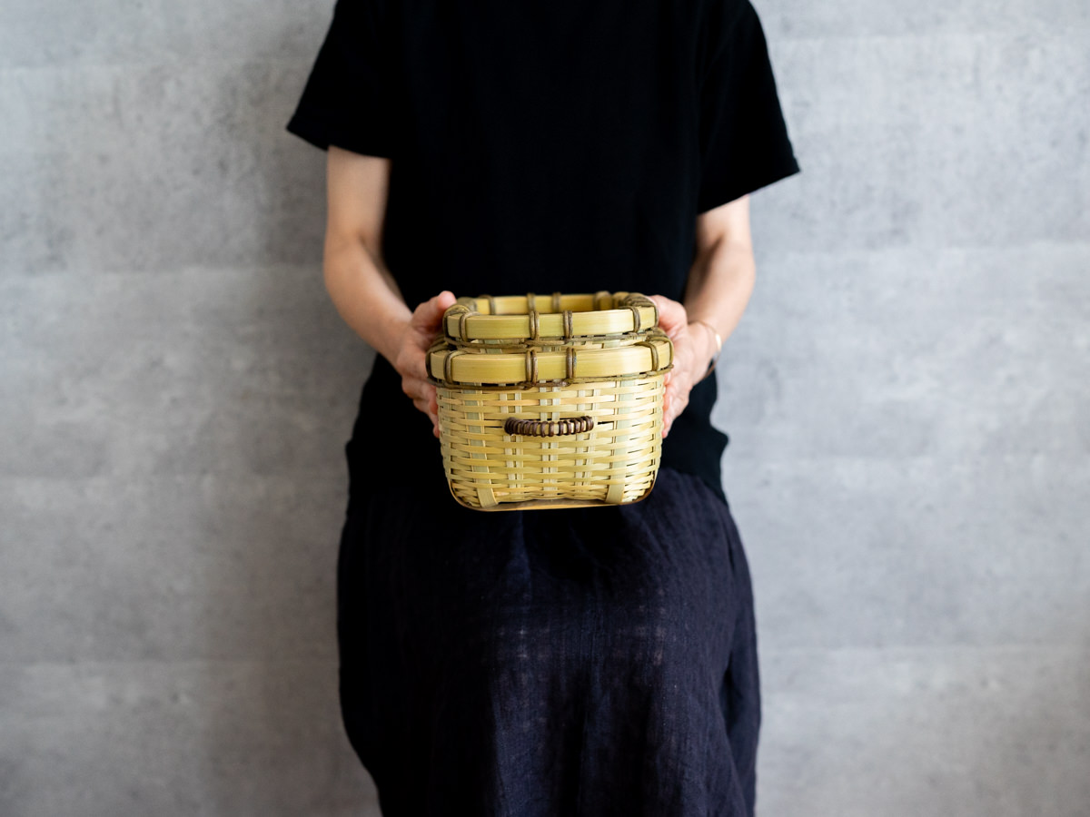 こちらは「青竹-あおたけ-」に“みがき”をかけたひごで、編まれた蓋付きのバスケットです。