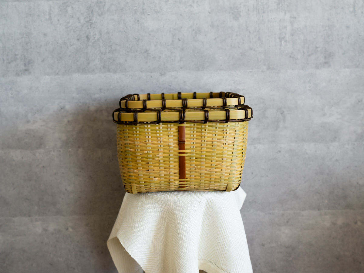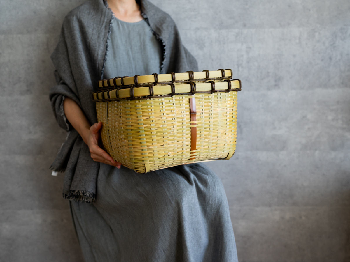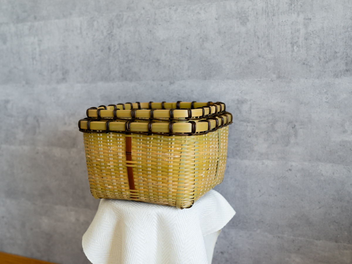 こちらは「青竹-あおたけ-」に“みがき”をかけたひごで、編まれた蓋付きのバスケットです。