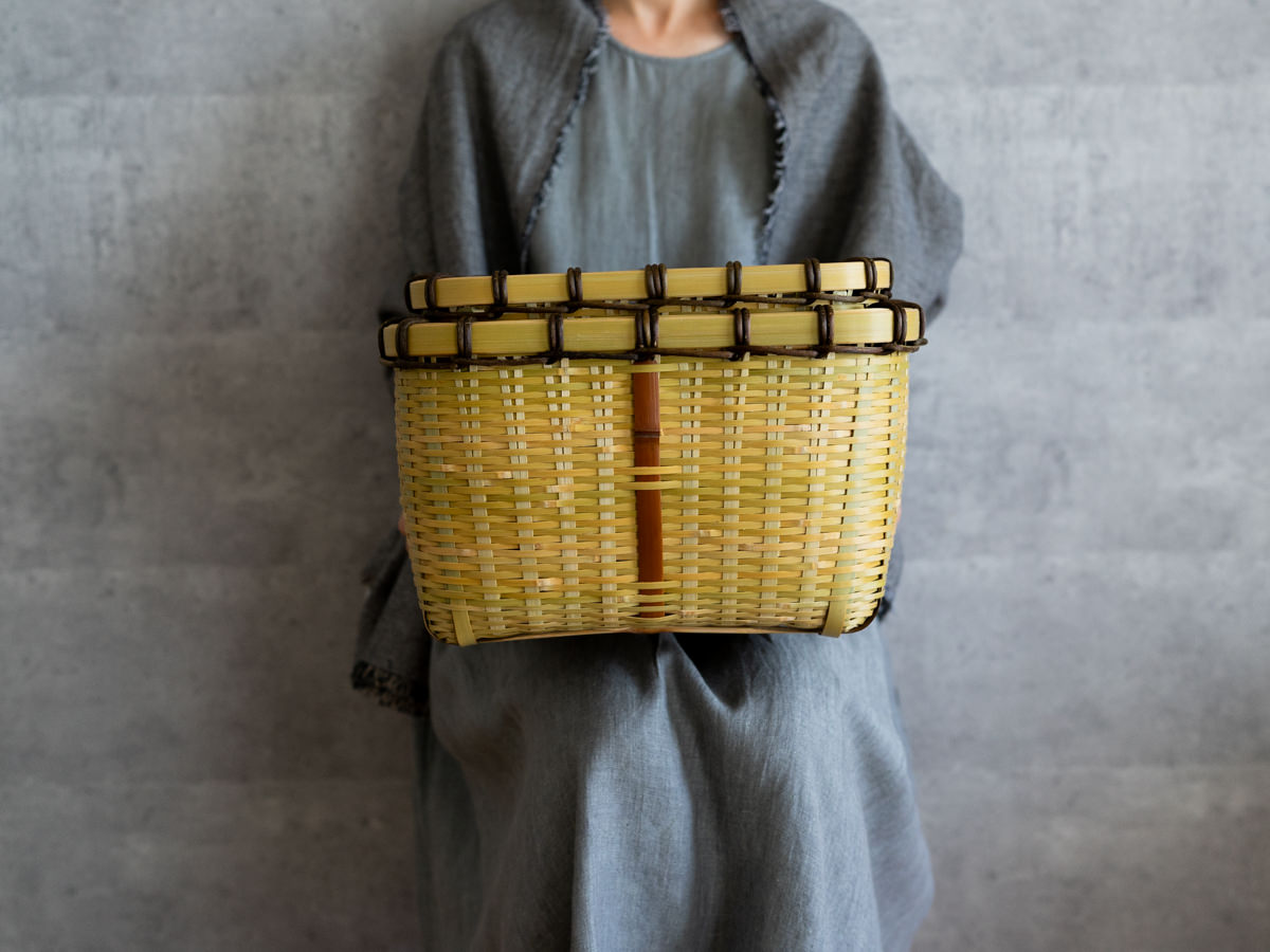 一本一本みがかれたひごで、丁寧に、そして力強く編まれているのがわかります。かごのどこに触れても、竹はささくれ立つものということをわすれてしまうほどの滑らかさです。バランスよく巻かれた、ツヅラフジの蔓がアクセントにもなっています。