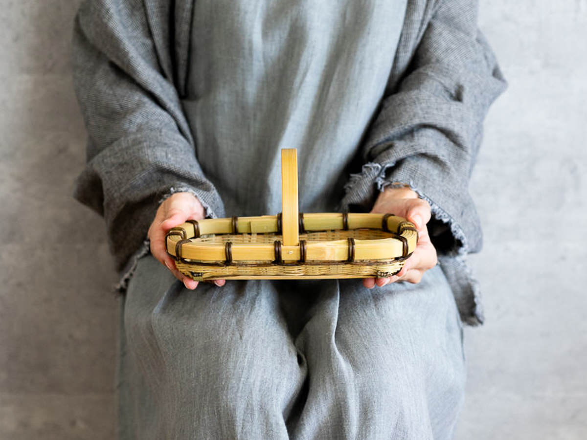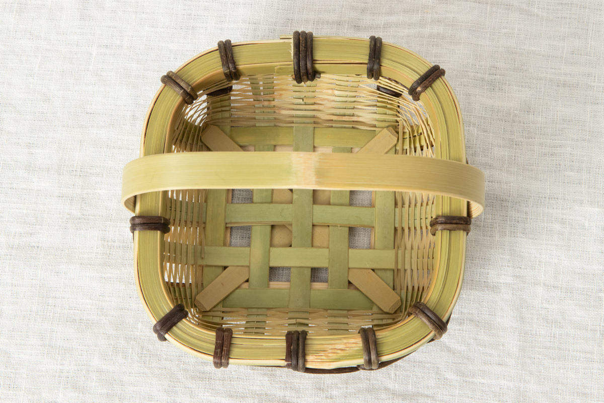 こちらは「青竹-あおたけ-」に“みがき”をかけたひごで、編まれた持ち手つきのバスケットです。