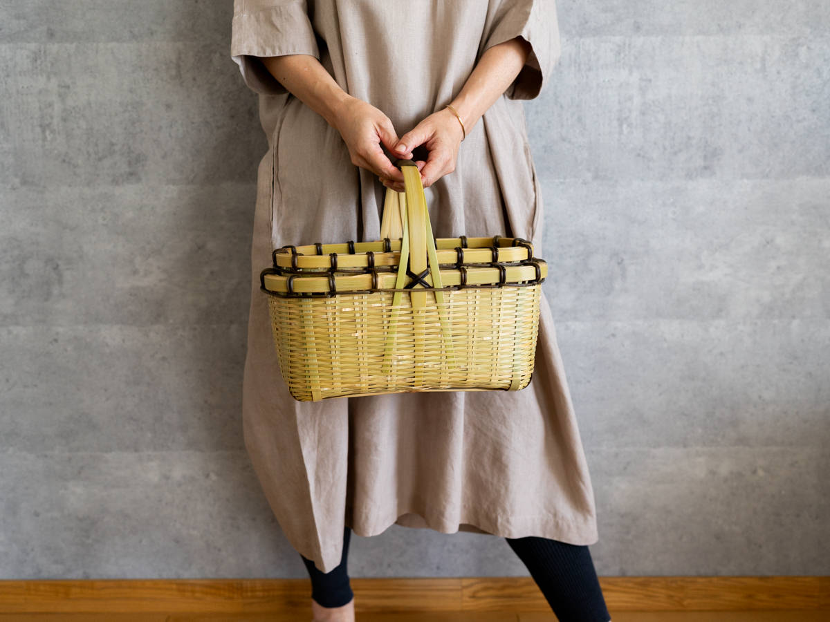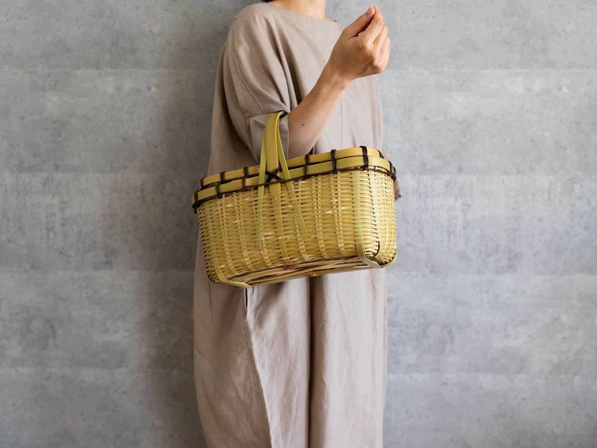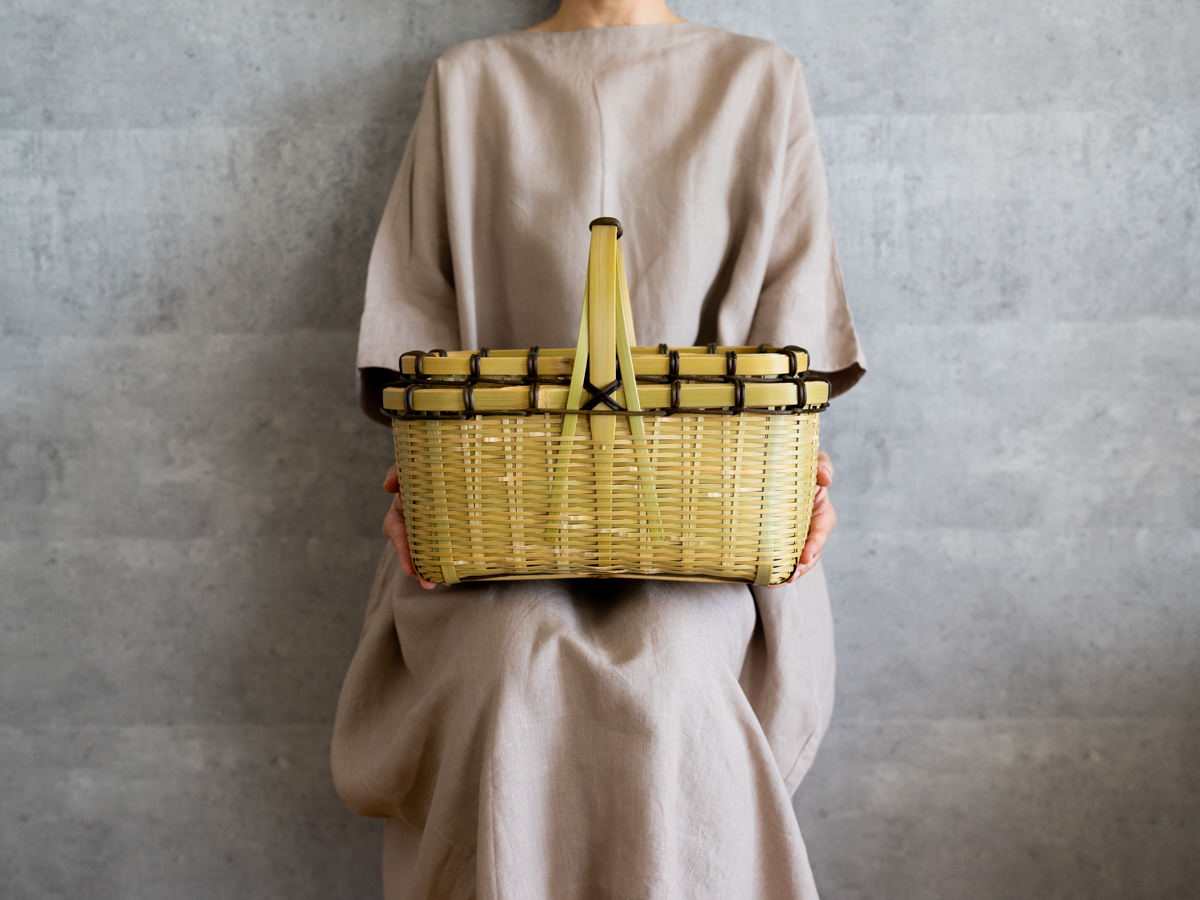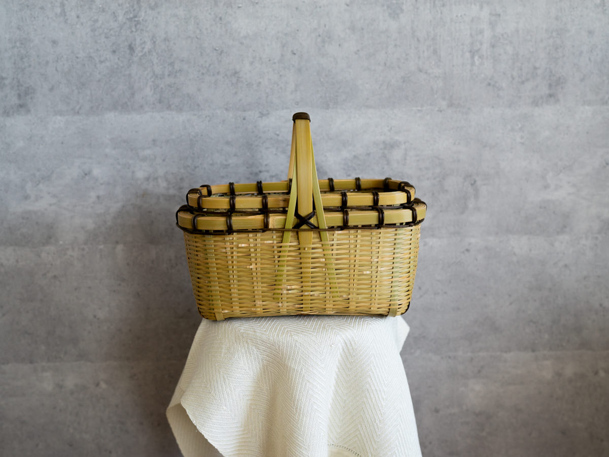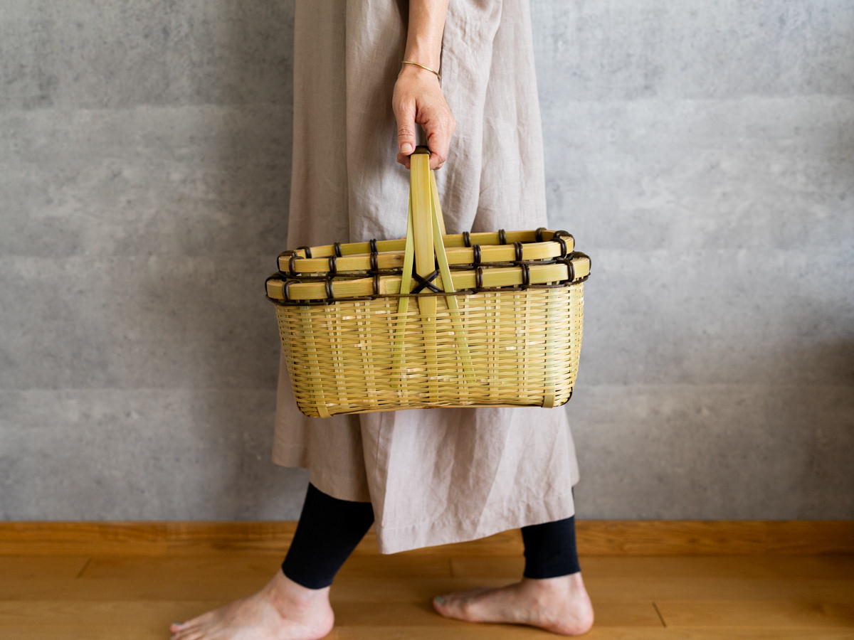 一本一本みがかれたひごで、丁寧に、そして力強く編まれているのがわかります。かごのどこに触れても、竹はささくれ立つものということをわすれてしまうほどの滑らかさです。バランスよく巻かれた、ツヅラフジの蔓がアクセントにもなっています。
