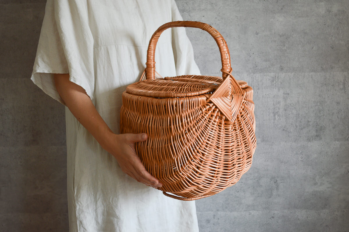 コロンと丸く、蓋のついた手付きかご。