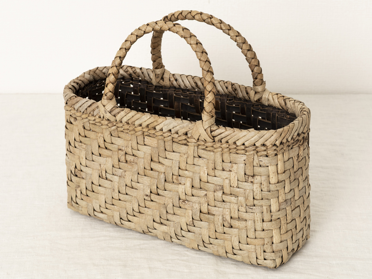 かごバッグとしては標準的なサイズ、かつオーソドックスなあじろ編みは、年齢を重ねても飽きない、長くつかえる魅力があります。