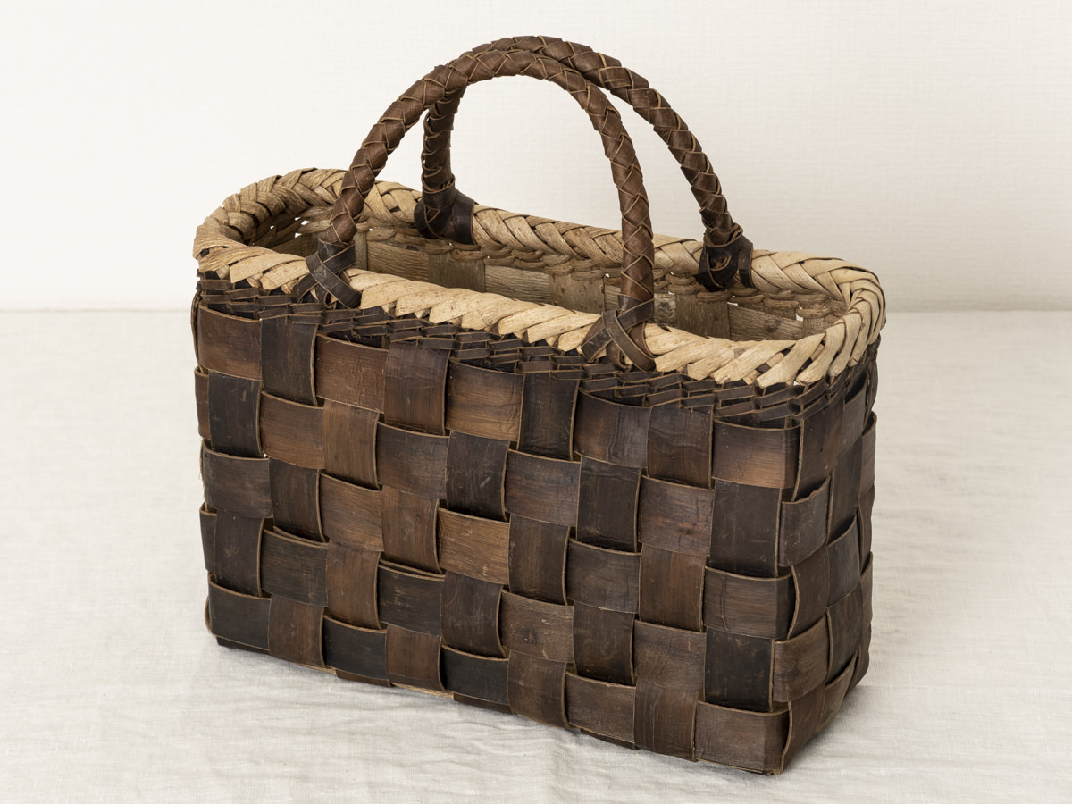 基本的にくるみ樹皮のこげ茶色をした裏皮が外側に来るように編まれています。縦横を交互に編む平織りで全体が編まれています。幅広のくるみの裏皮の質感がぞんぶんに味わえるような風合いです。かごの縁下には、おなじく裏皮のひごのステッチが2本通っています。