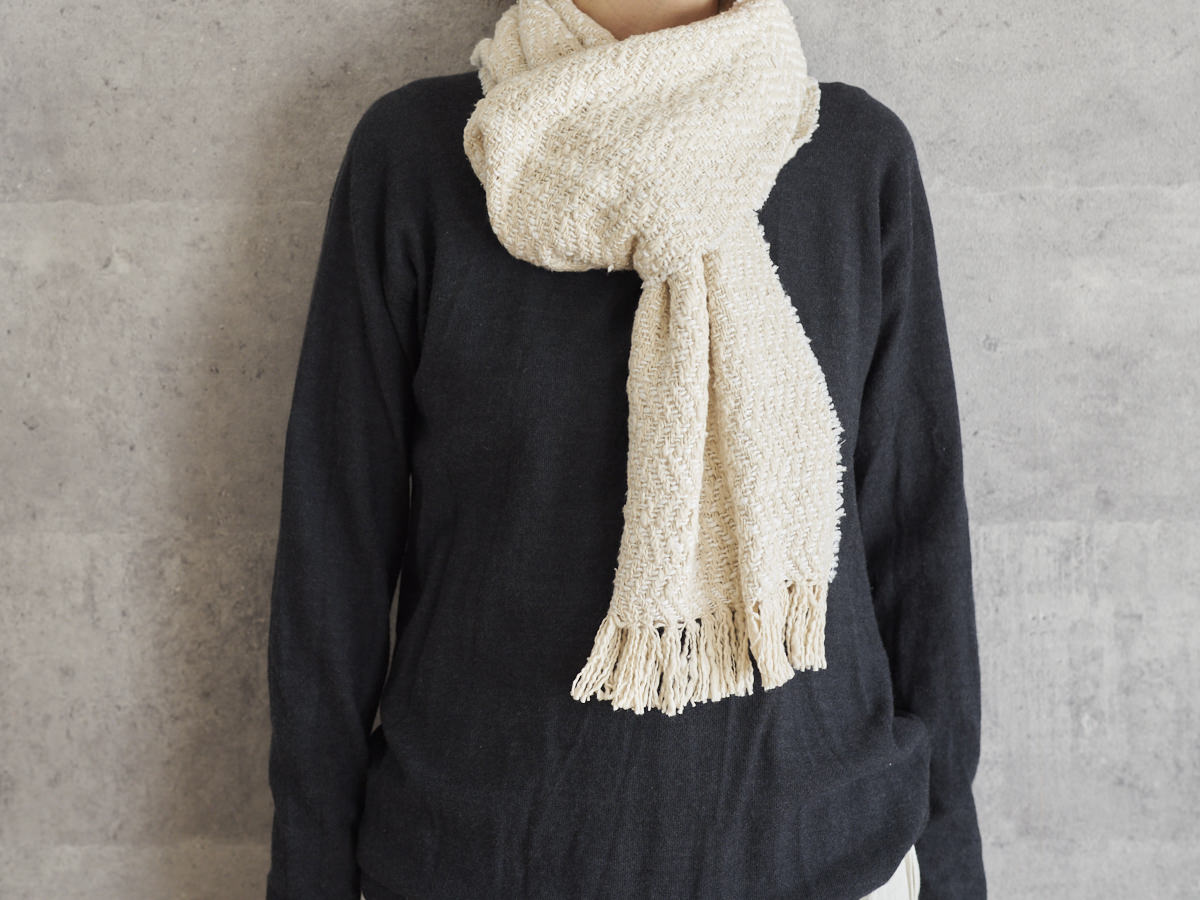 こちらの【Herringbone-Ivory】タイプは、明るいホワイトカラーとガラ紡のふんわりとした柔らかさが相まって、やさしく可愛らしい雰囲気です。ヘリンボーン柄がほのかに浮かびあがり、素朴でありながら上品さも感じられ、飽きのこないデザイン。マフラーとして首に巻くと、ボリュームがでて、装いにも華を添えてくれます。