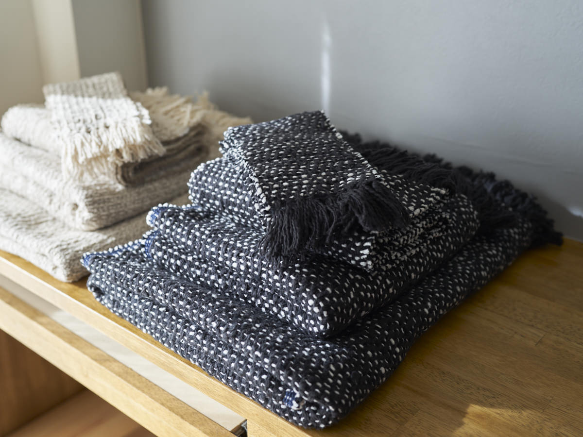 肩から羽織ったり、またひざ掛けとしてもつかい勝手のよいサイズ。たて糸のチャコールグレーが、白と黒のくっきりとした色味をやわらげてくれています。ヘリンボーン柄がほのかに浮かびあがり、上品さも感じられます。