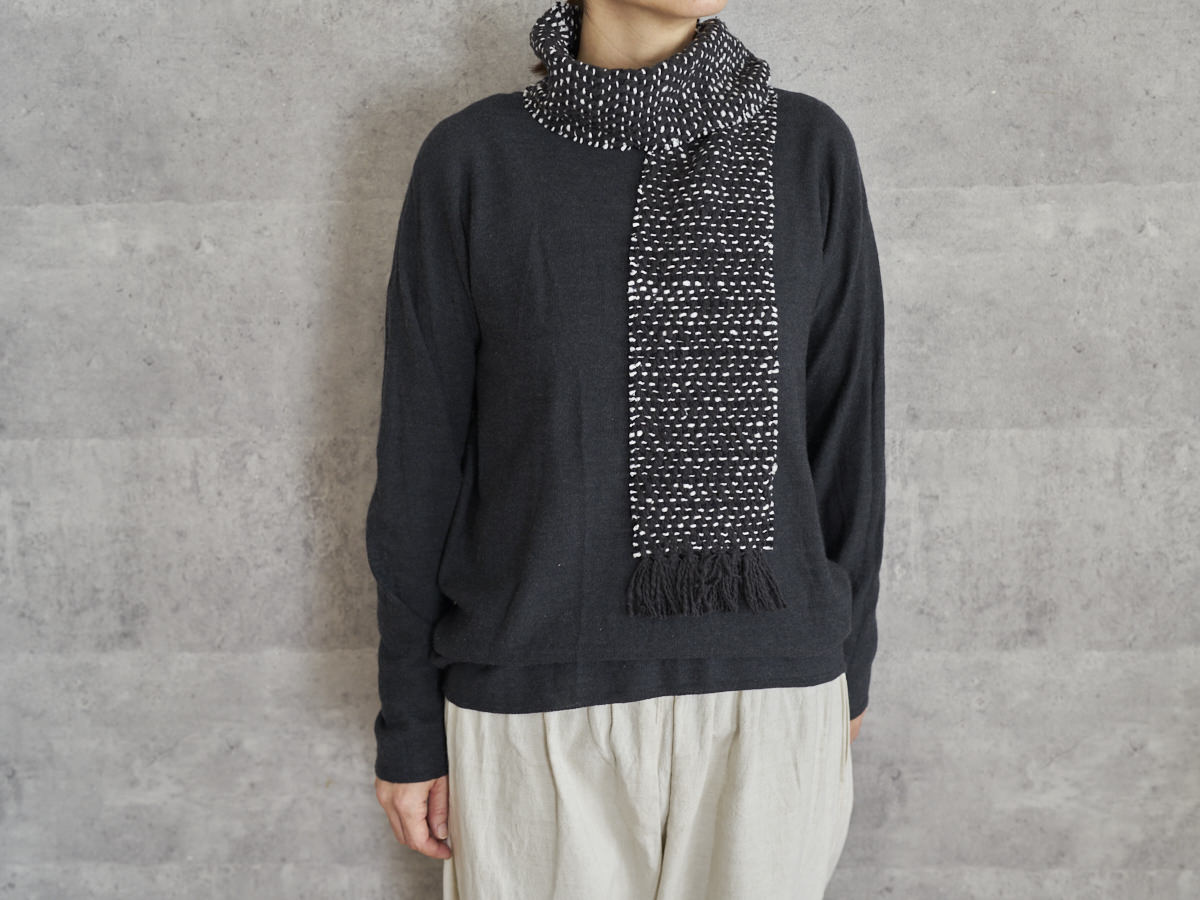 ぽこぽことしたガラ紡糸によって、ムラのある水玉模様が浮かびあがり、まるで夜空にふる雪のよう。マフラーとして首に巻くと、ボリュームがでて、装いにも華を添えてくれます。