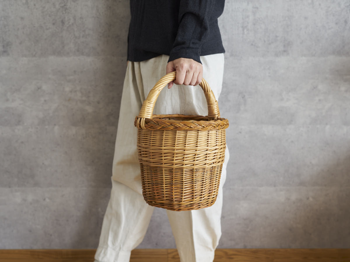 縦長のシルエットは、かごバッグのなかでもすっきりと見え、
