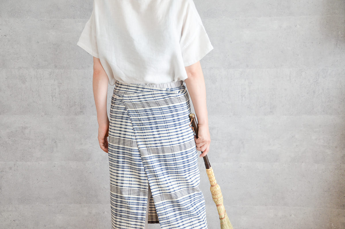 腰のあたりにくる紐は、長さ85cmほどです。裾またはサイドには、生地耳が使われる仕様になっています。