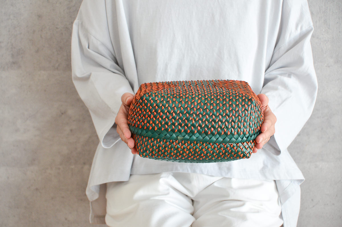 こちらは、パーム(ヤシ)の葉を素材にして作られた、蓋付きのバスケットです。