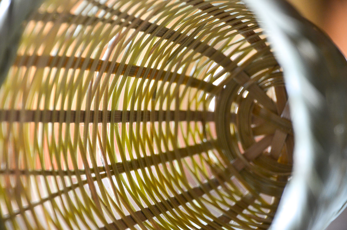 側面は細めのひごを使い、ござ目編みという編み方で規則的に編んでいます。外側に表皮が来るように全体が編まれています。すべて表皮がついたひごです。