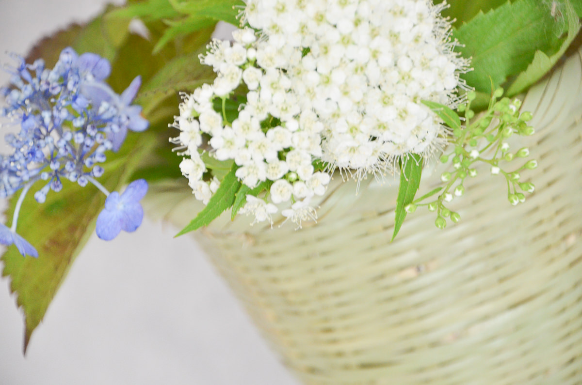 写真では、水の入った小さなコップを中に入れて、野花を活けています。