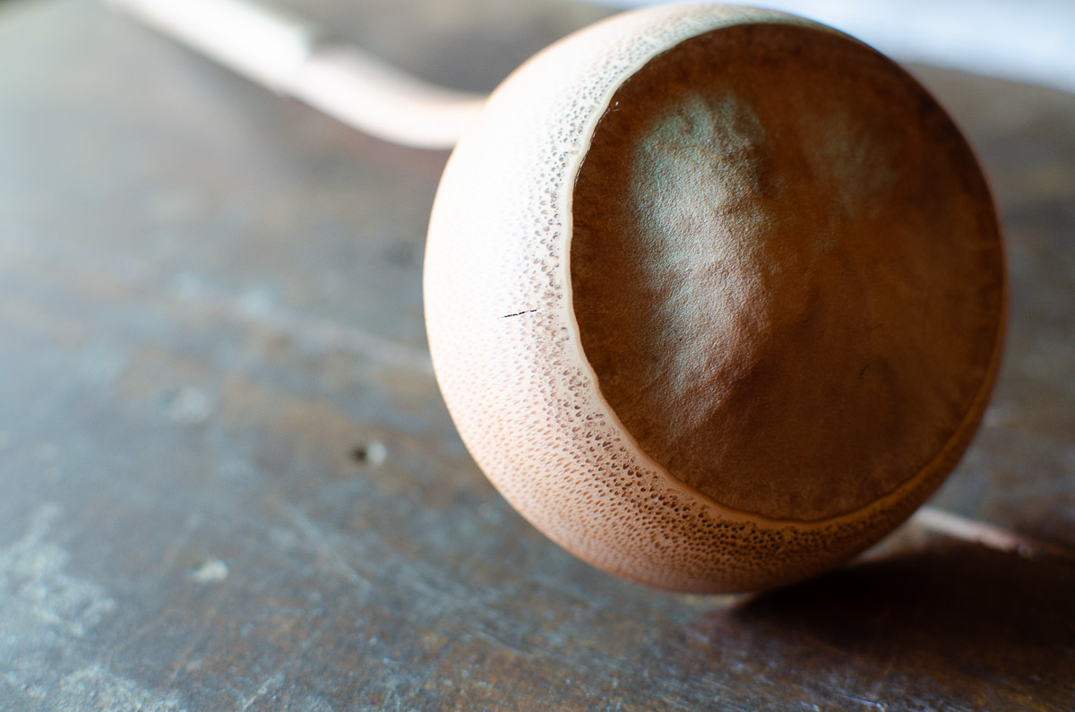 穴開きタイプのお玉部分です。7つの穴が開けてあります。節の部分は高圧釜や炭窯での熱を入れる工程を経ることでしっかりと硬く締まり、お玉の用途として使う分には割れるような心配はありません。