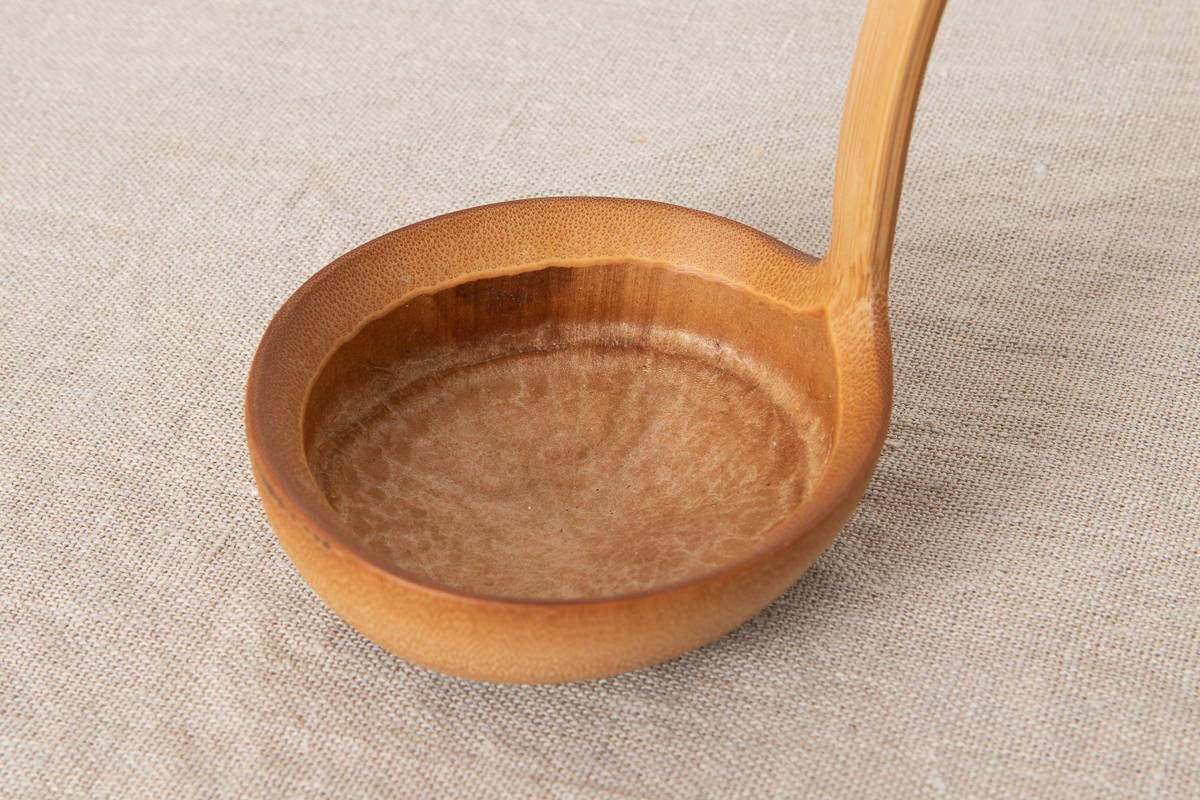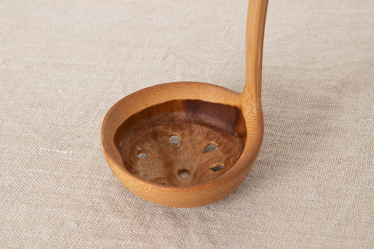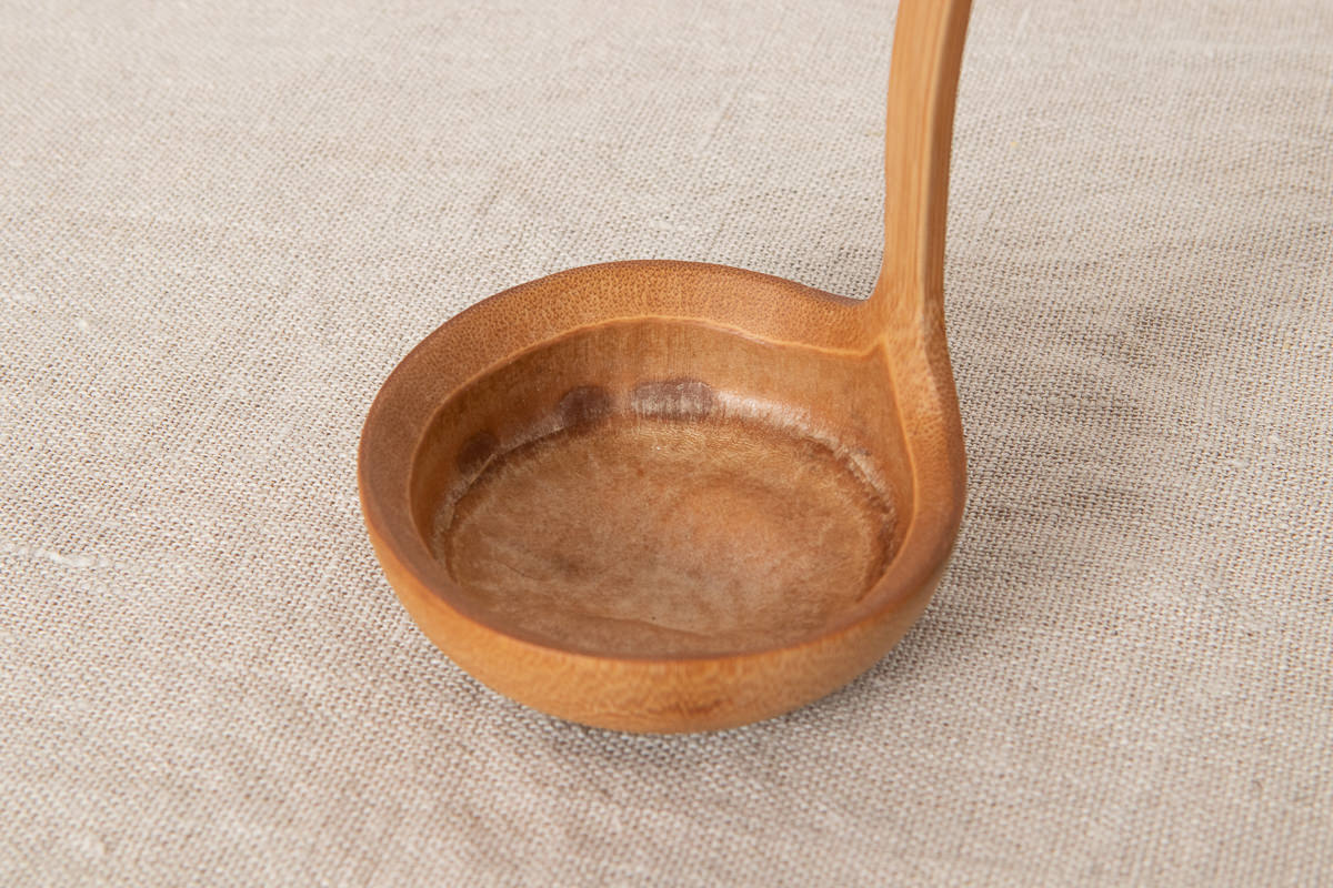 こちらは穴開きタイプです。どちらのタイプも持ち手からお玉部分にかけて竹を反らせていますが、このカーブがあることですくいやすさが増しています。