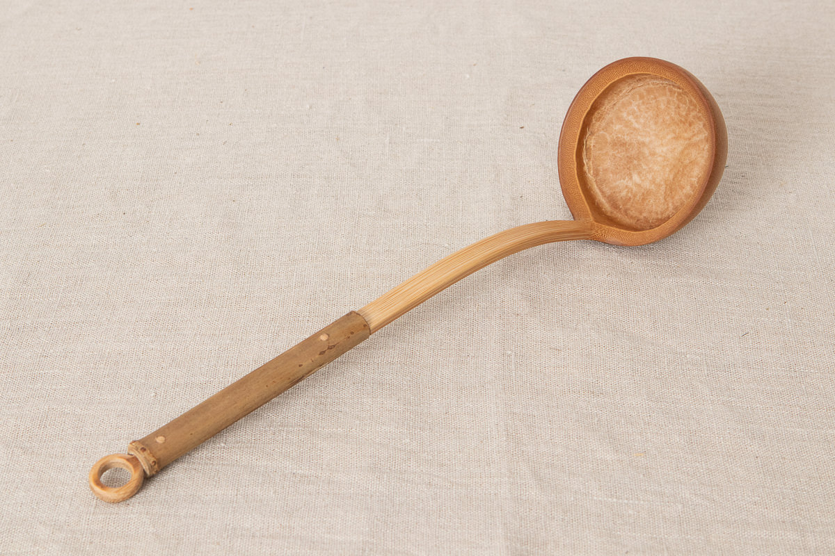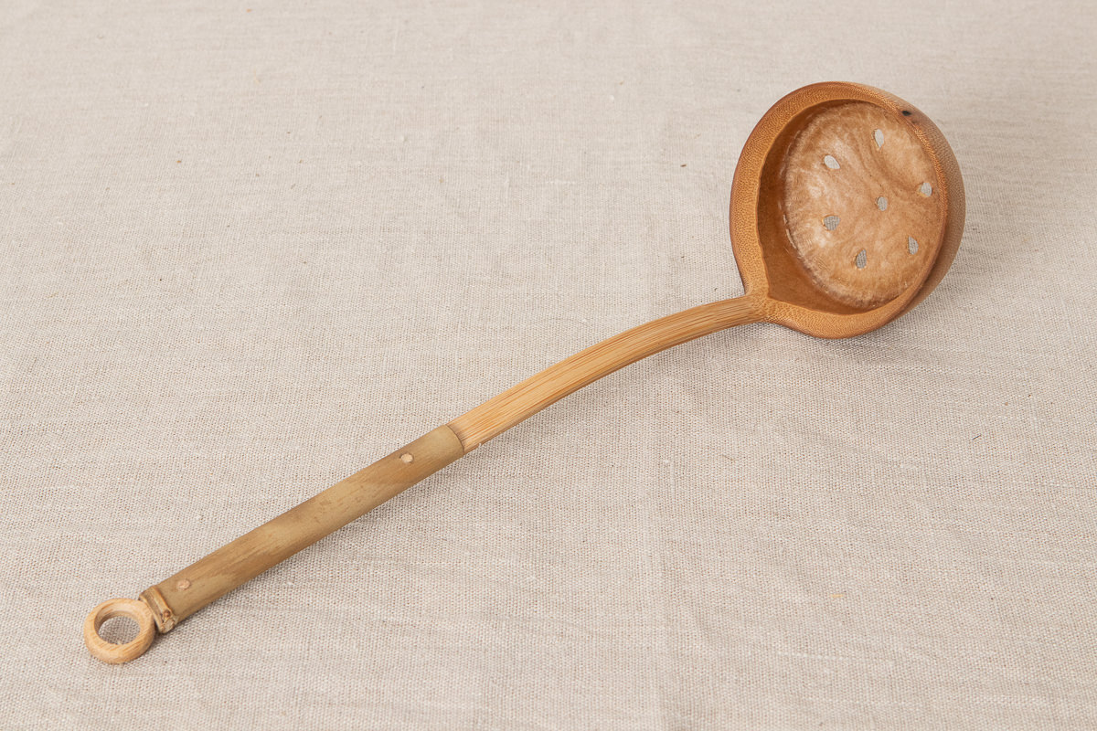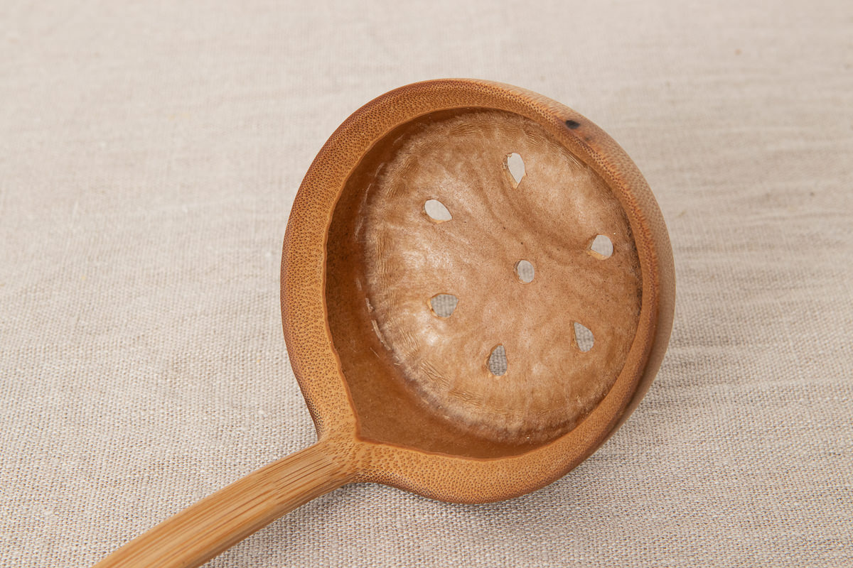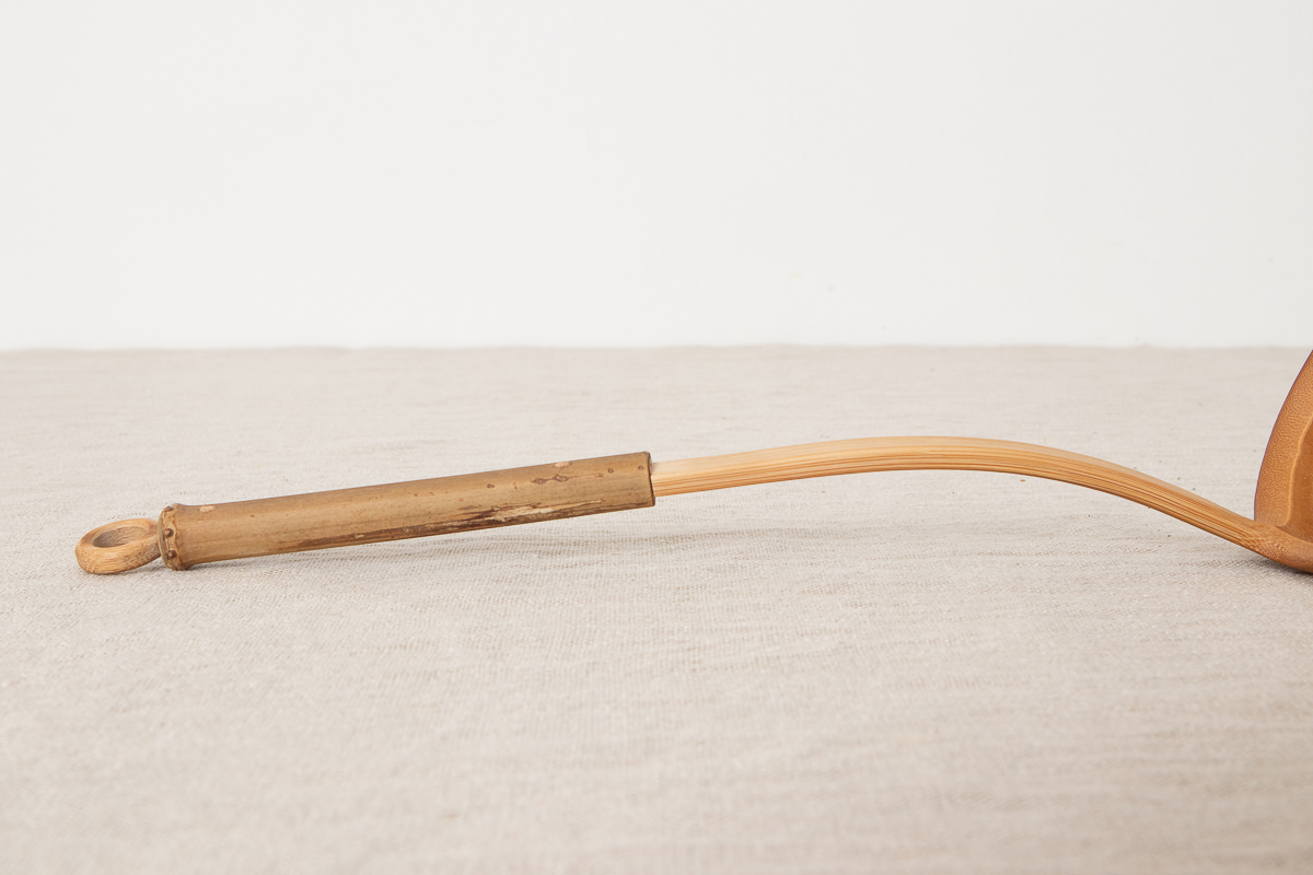こちらは穴開きタイプです。どちらのタイプも持ち手からお玉部分にかけて竹を反らせていますが、このカーブがあることですくいやすさが増しています。