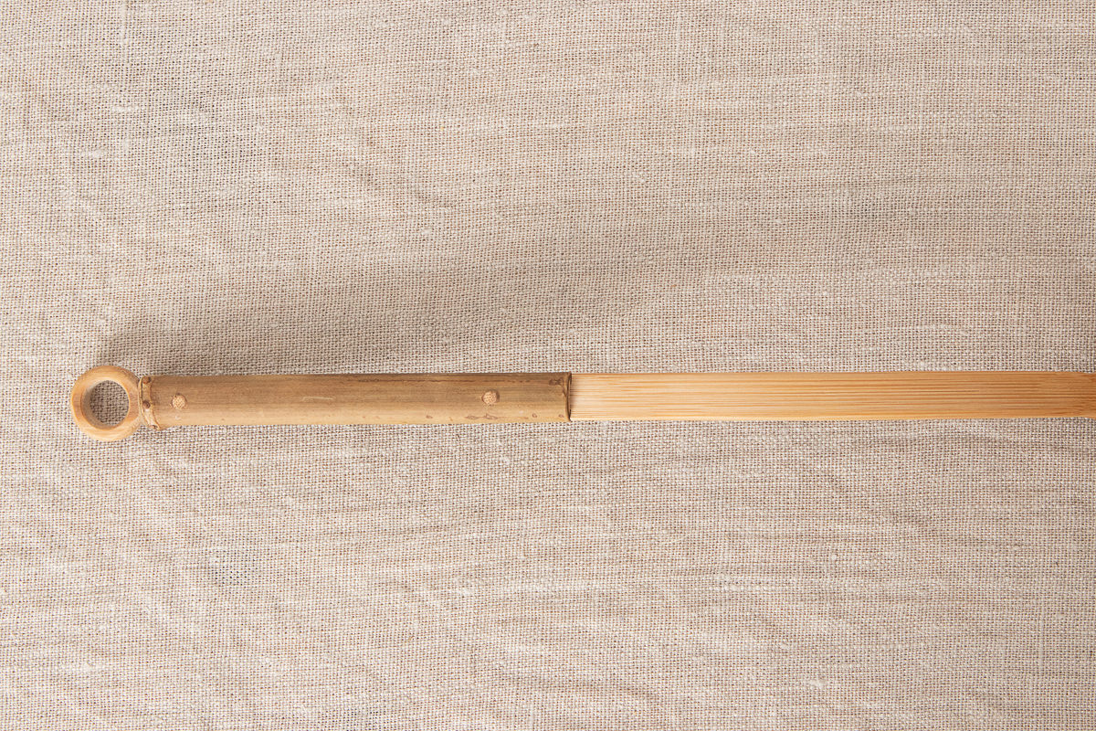 持ち手の四方竹には上からと下から、竹を差して接続させています。写真ですと左からと右から、それぞれのパーツを四方竹に差し込んでいます。どちらも差したのち、それをまた竹釘(たけくぎ)で留めています。持ち手の上部には輪っか状にした竹が取り付けられているので、どこかに引っ掛けるときに重宝します。