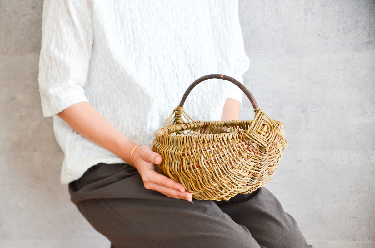 この持ち手と縁の接続部分の飾り編みが印象的です。ヨーロッパのかご細工によく見られる装飾で、かご全体のアクセントになっているように思います。
