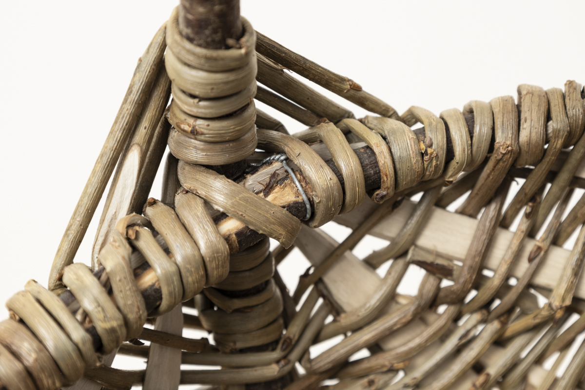 まずかごのフレームが作られ、そこにやなぎの枝を編みつけるようにして作られています。