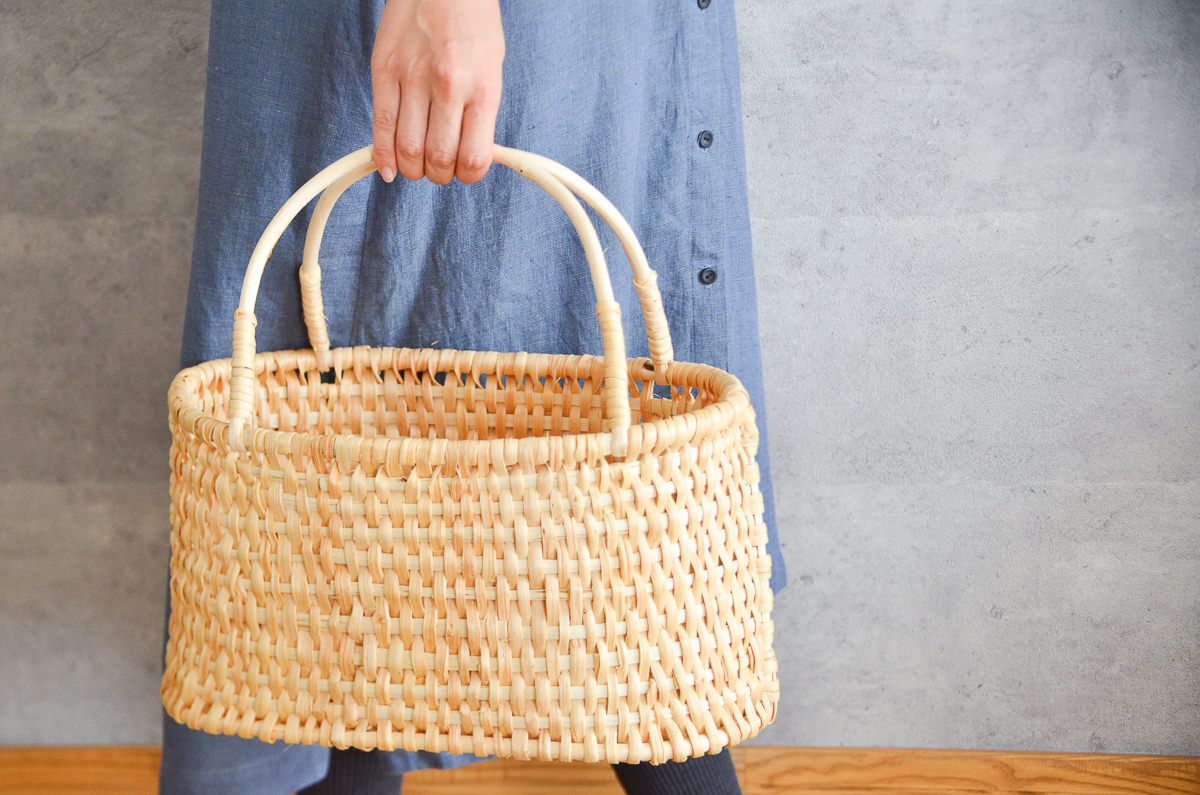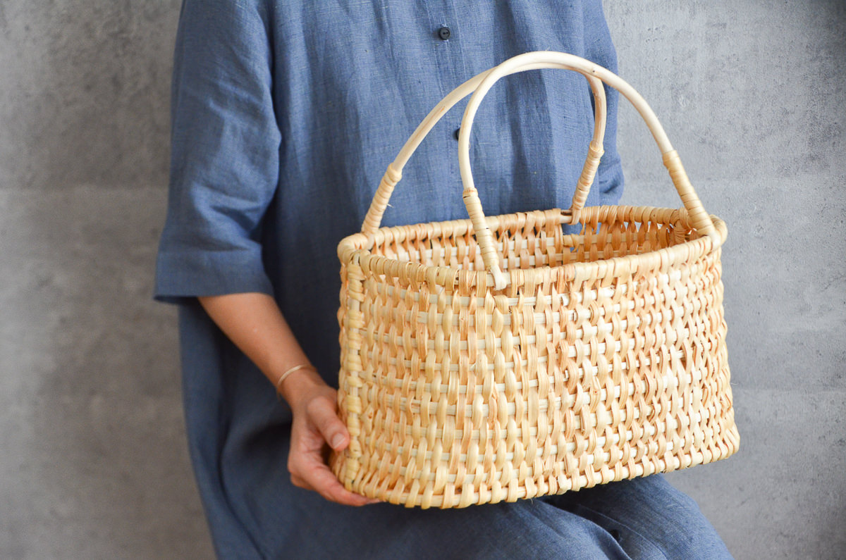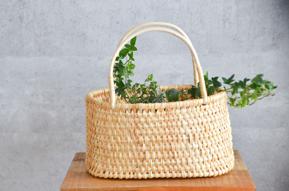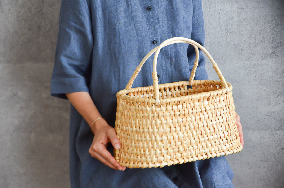 荷物が多いときに頼れるサイズ感です。日々のお買い物にも、エコバッグとして。型を使わずに編まれた松の根のかご。