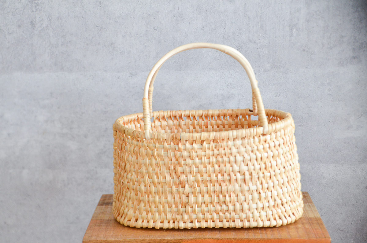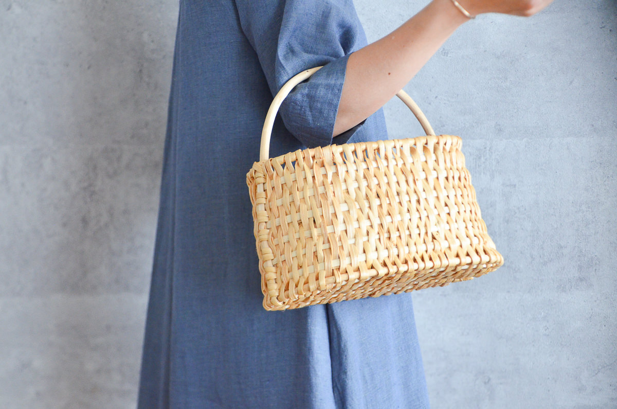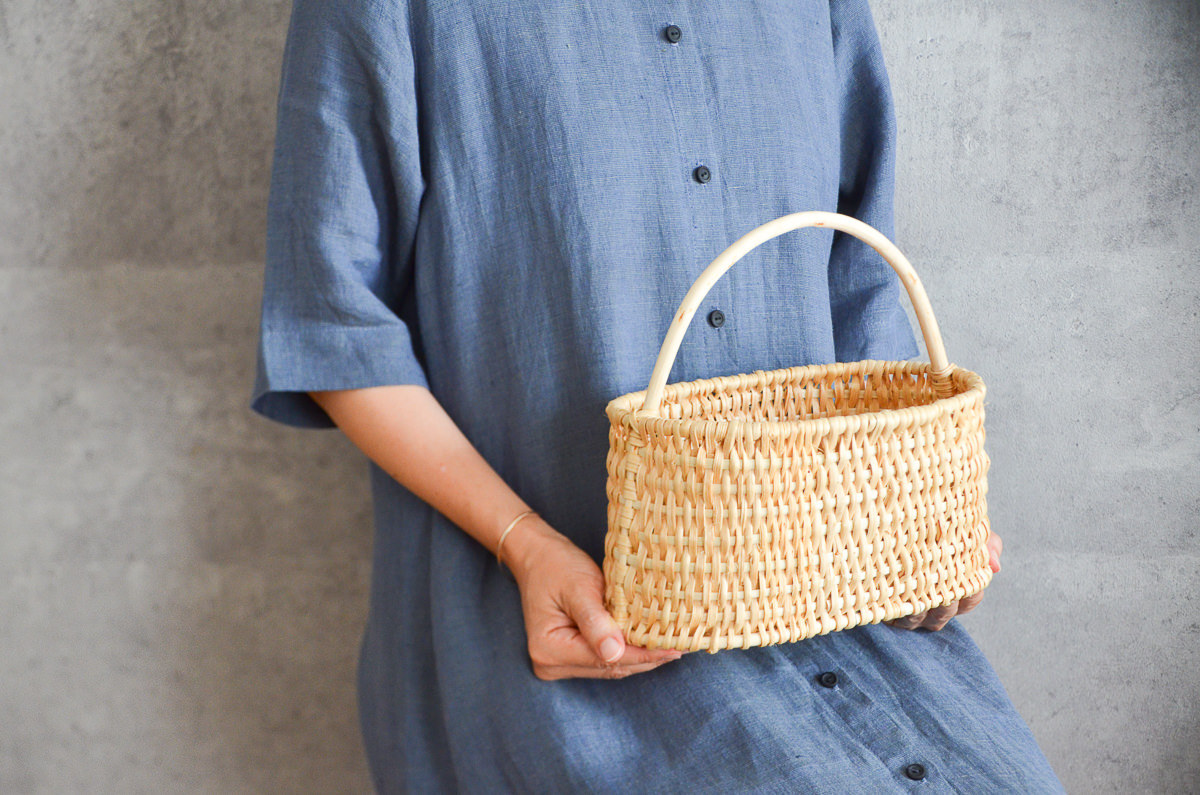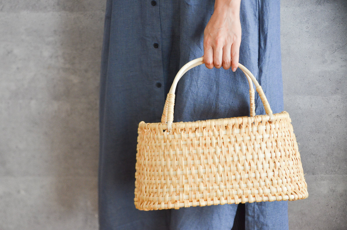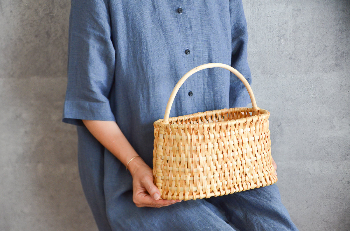 荷物が多いときに頼れるサイズ感です。日々のお買い物にも、エコバッグとして。型を使わずに編まれた松の根のかご。