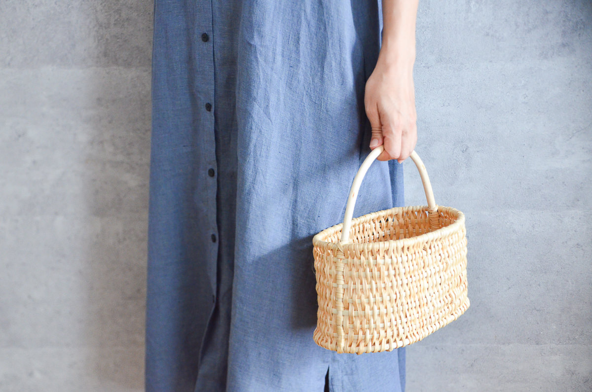 財布、キーケース、携帯電話、ミニタオルが余裕をもって入る大きさです。横幅があるので、長財布も入ると思います(念のため、サイズ表記欄にて寸法をご確認ください)。オーバル型で、体に沿わせて持ちやすい形です。収納用のかごとしても。