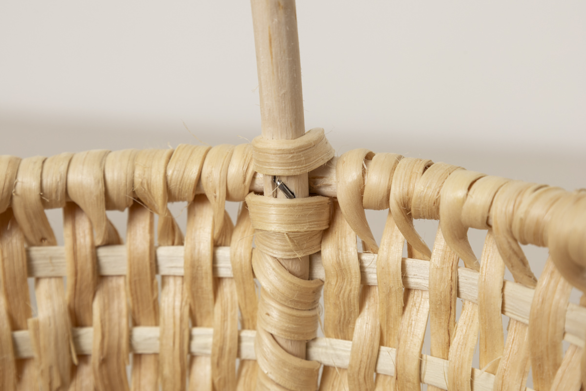 こちらのかごは、まずかごのフレームを作り、そこに松の根を編み付けていきますが、そのフレームには、サクラの木が使われています。持ち手もおなじくサクラの木で作られています。かごのサイドを通って下の縁に固定されており、抜けてしまうようなことはなく、安心の作りです。