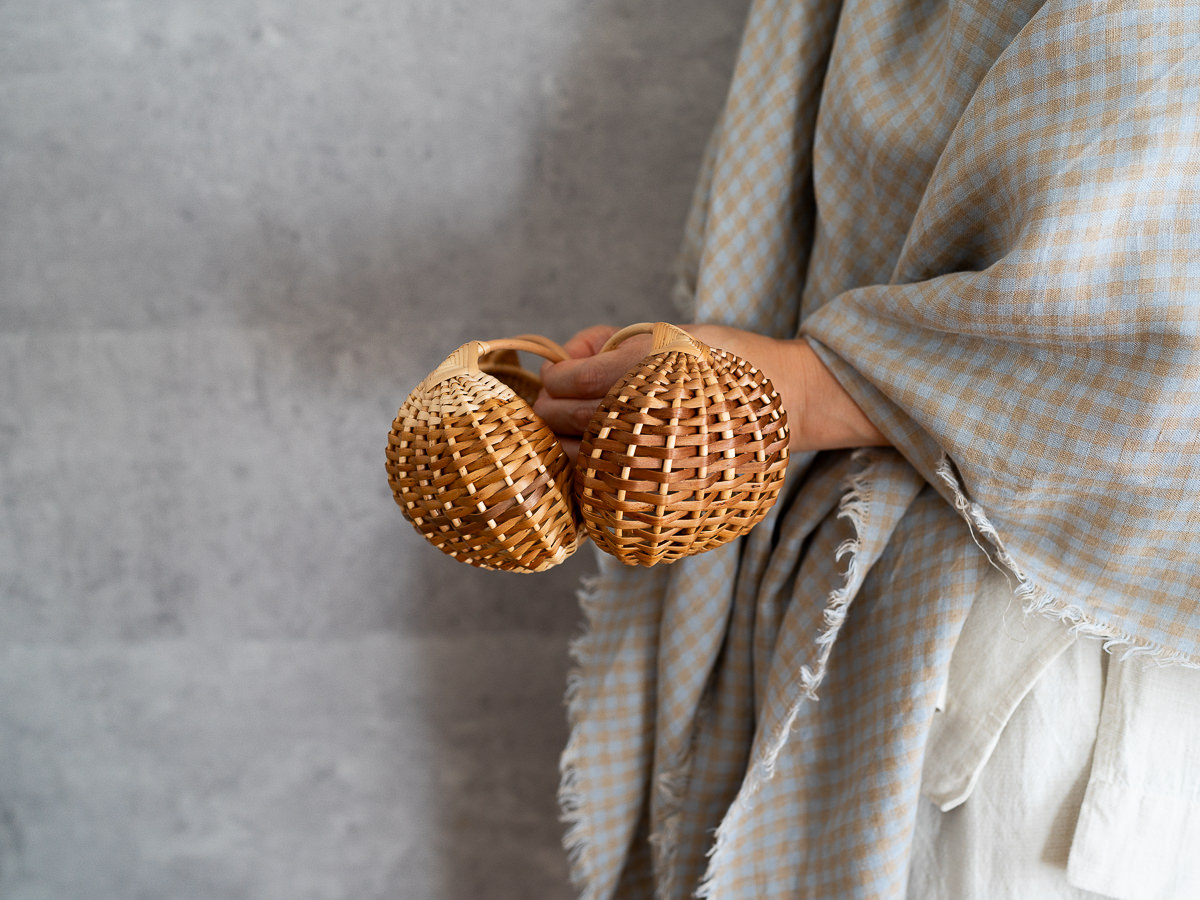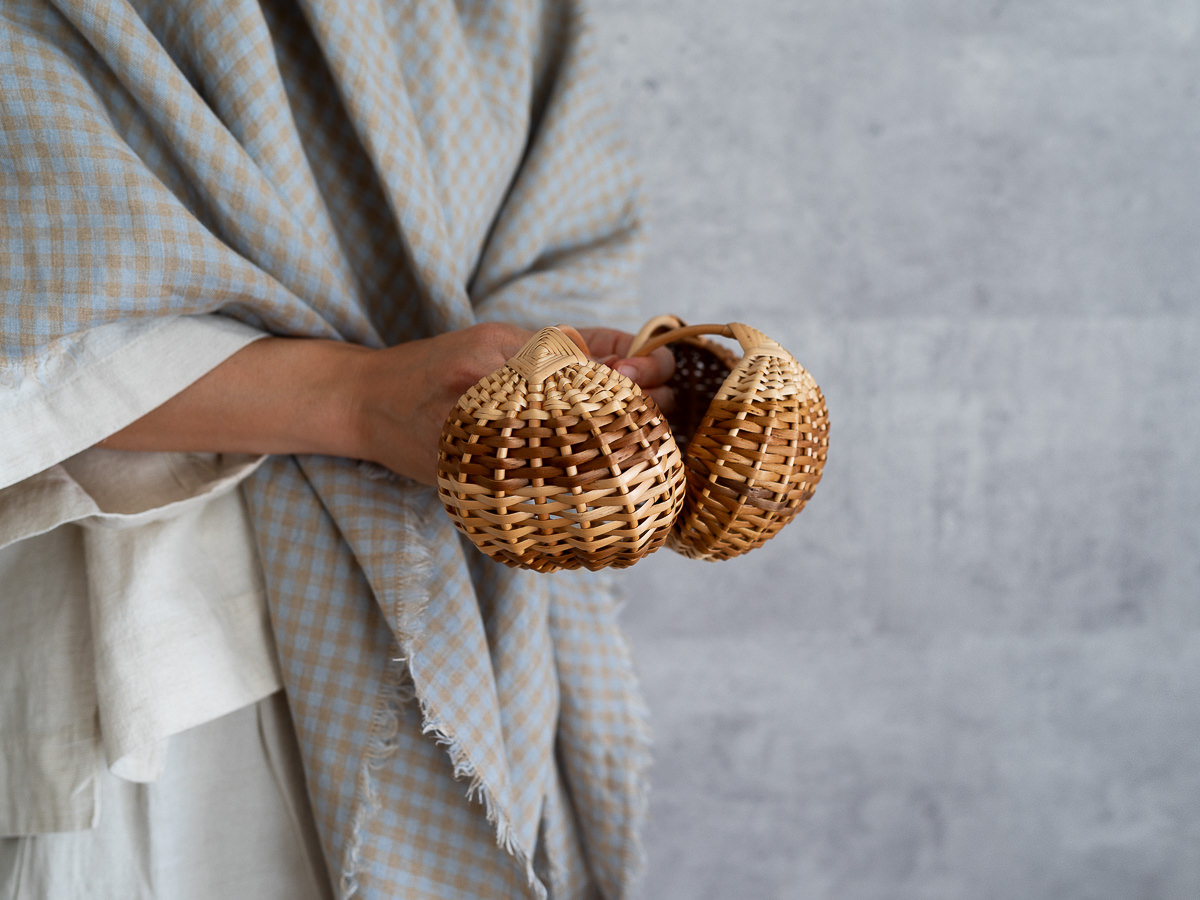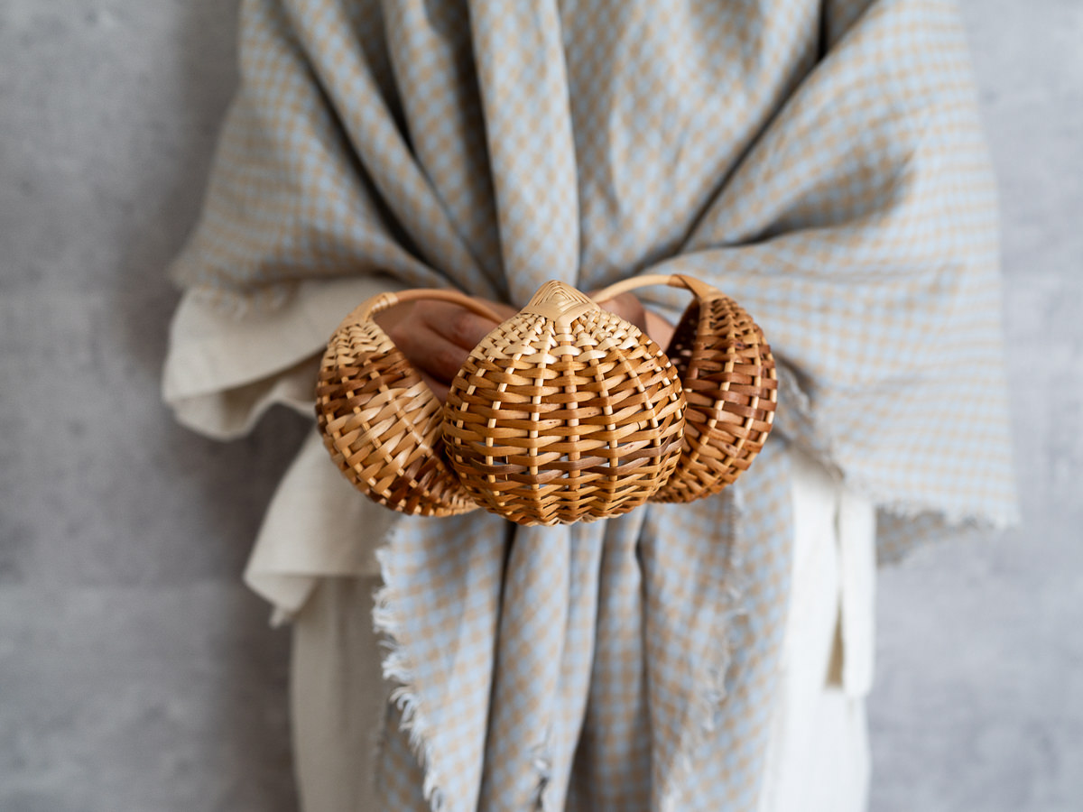 いずれのタイプも、大きさやかたちはほぼ同じです。やなぎの芯を横の基軸にして、裂いた状態にしたひごを編みこみながら作られています。