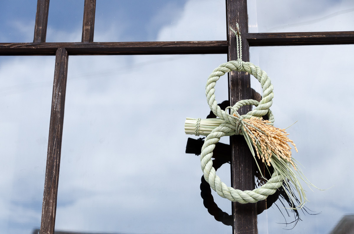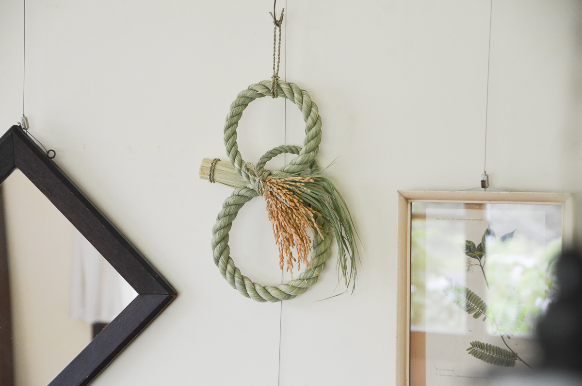 一見わかりにくいですが、よく見るとこちらのしめかざりは”一本のしめ縄”を使い、ひと息で、一筆書きのように作られています。そうしてできあがった、大きさのことなる三つの輪を三拍子に見立てています。