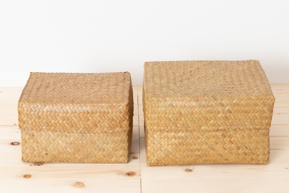 こちらのページでは、「カチュー」製、蓋付き、上から見ると長方形タイプの整理かご「S、M」2サイズをご紹介します。