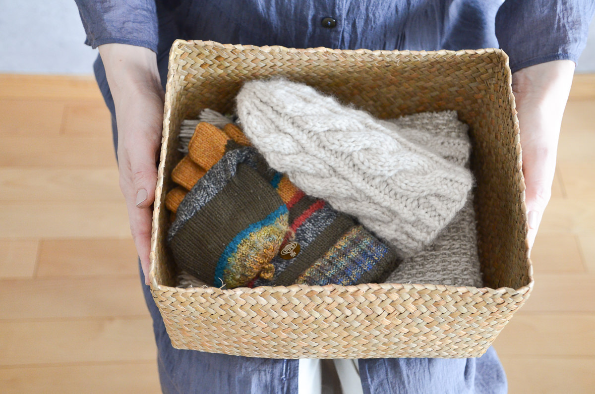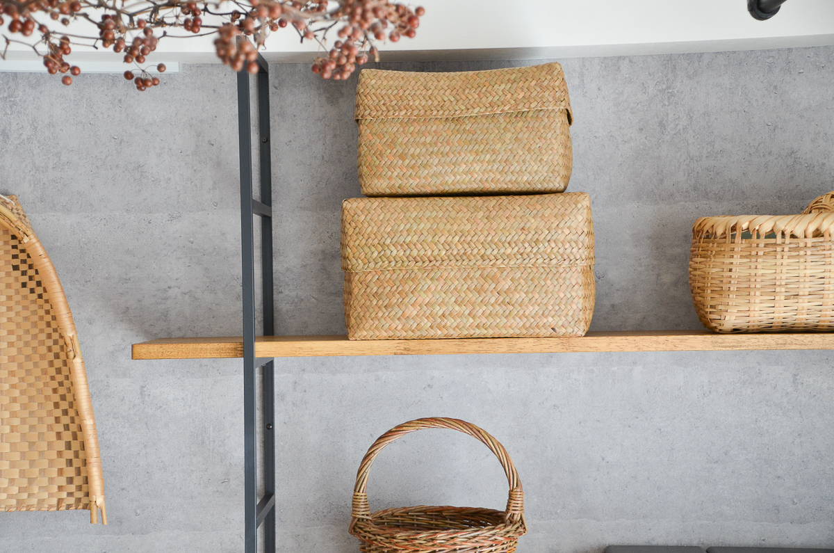 角型のかごは、並べて収納したり、重ねて置いても良さそうです。