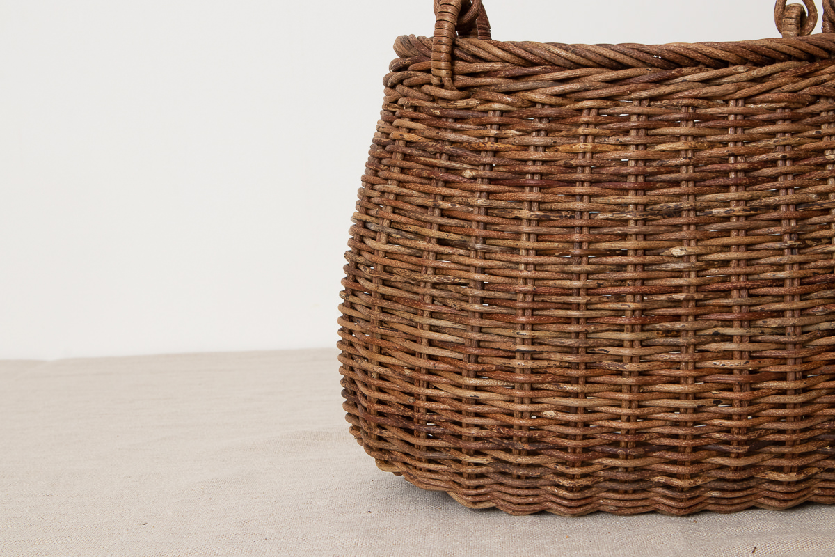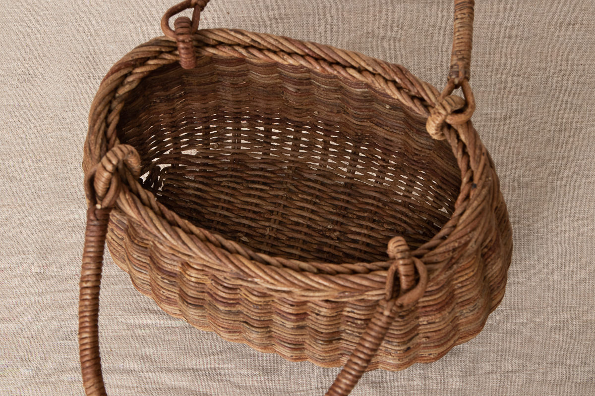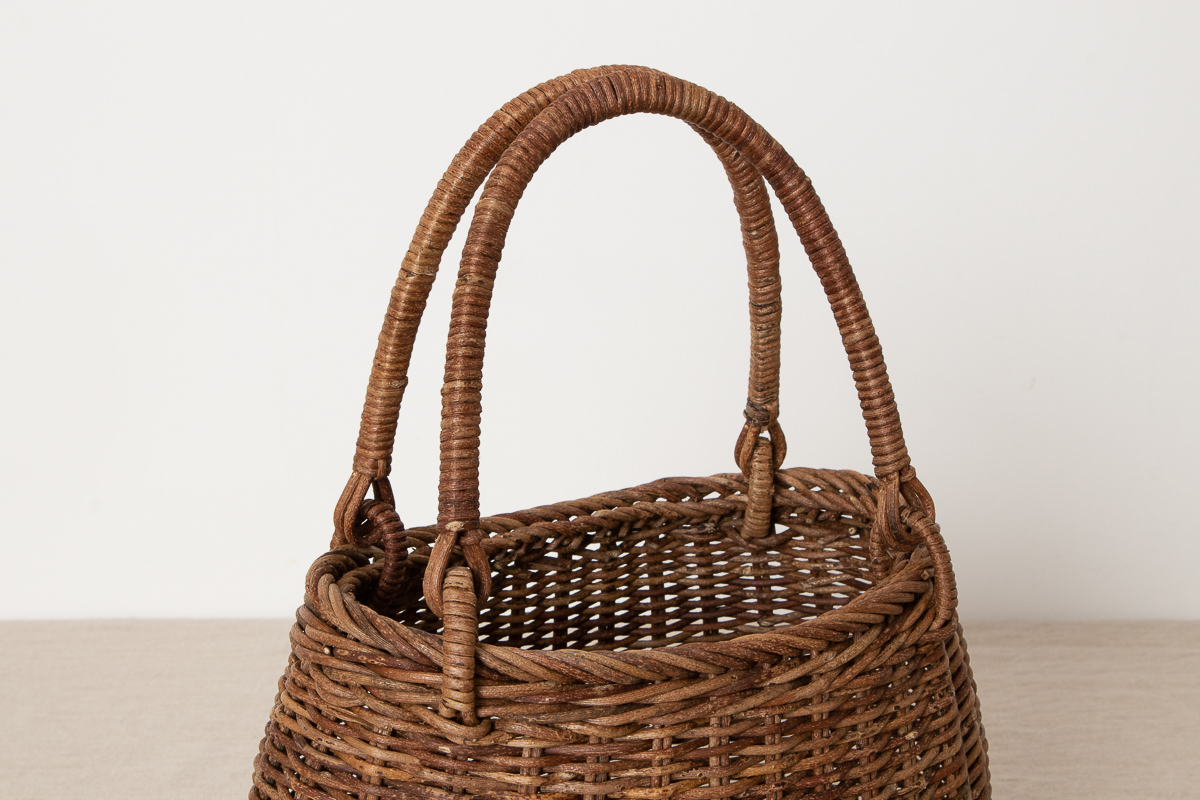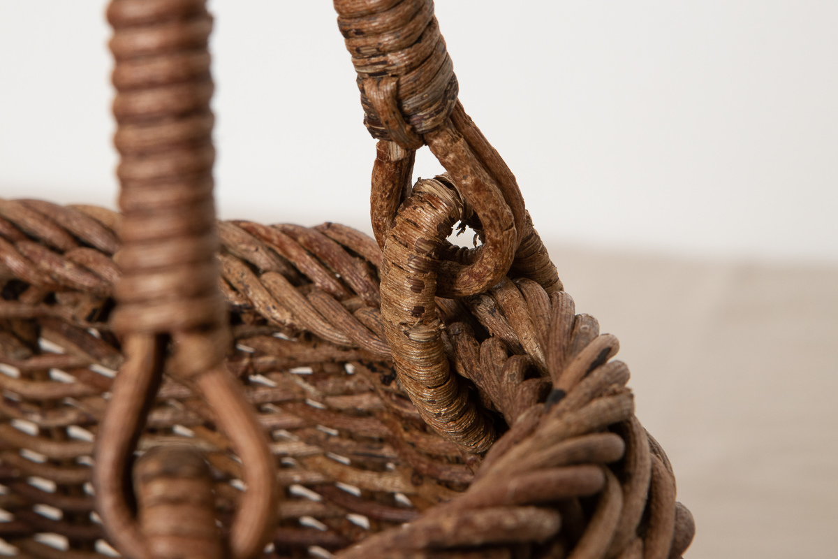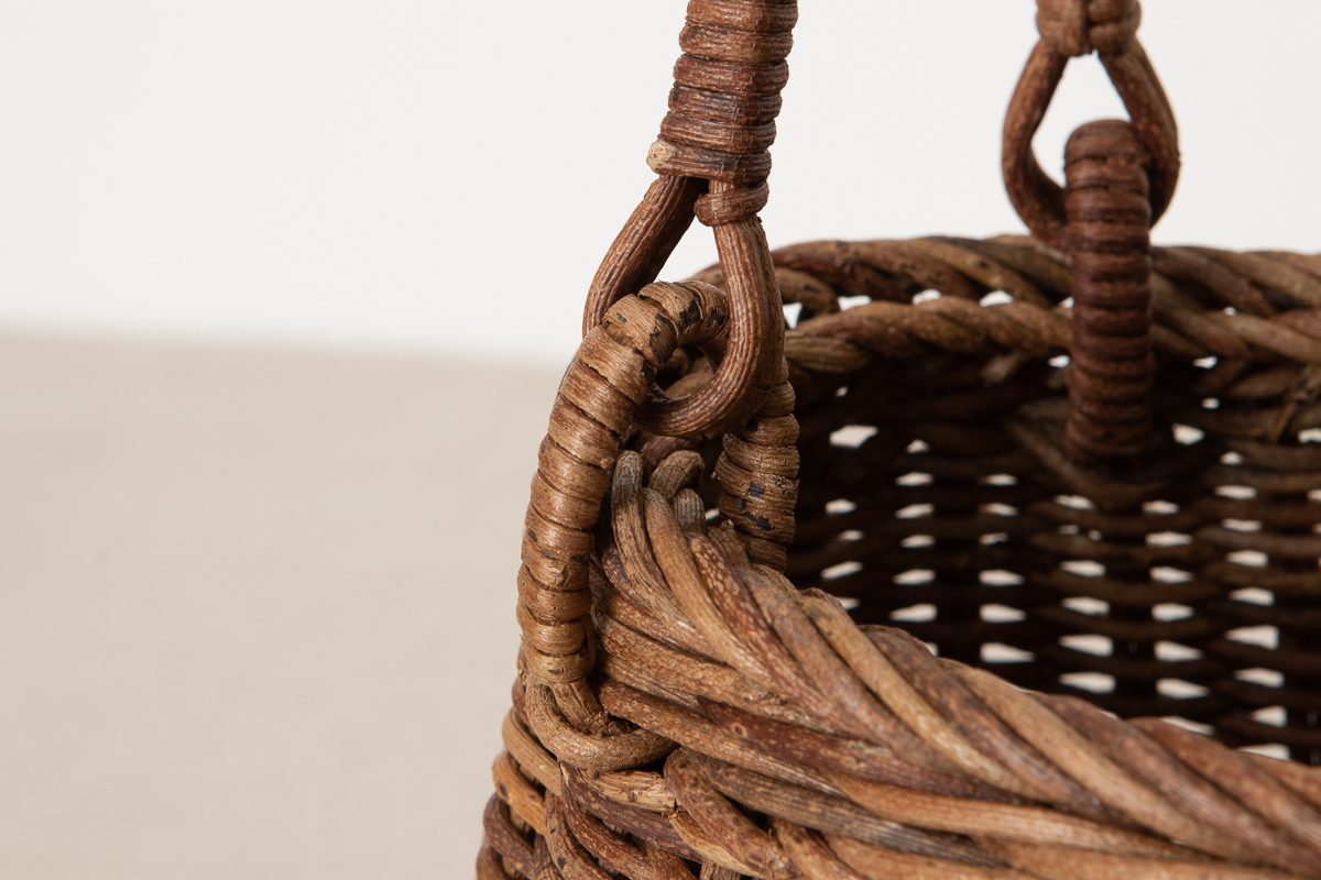 かごの持ち手はあけび蔓を芯材して、そのまわりにあけびの蔓を巻きつけています。細すぎず太すぎず、ちょうど手に握りやすい太さ。また、かごに対する持ち手の大きさ、かたちも、黄金比といえそうなバランスの良さです。