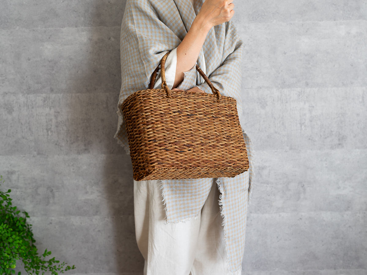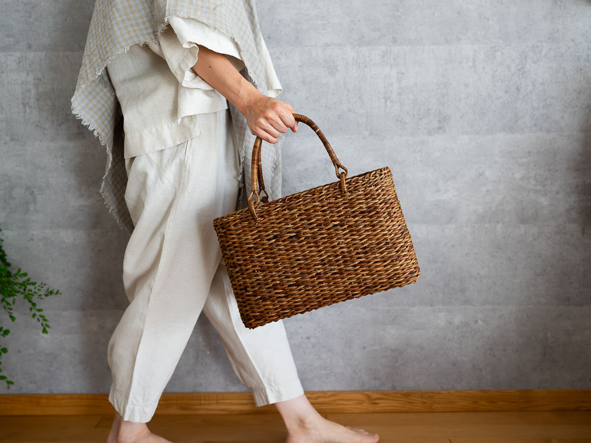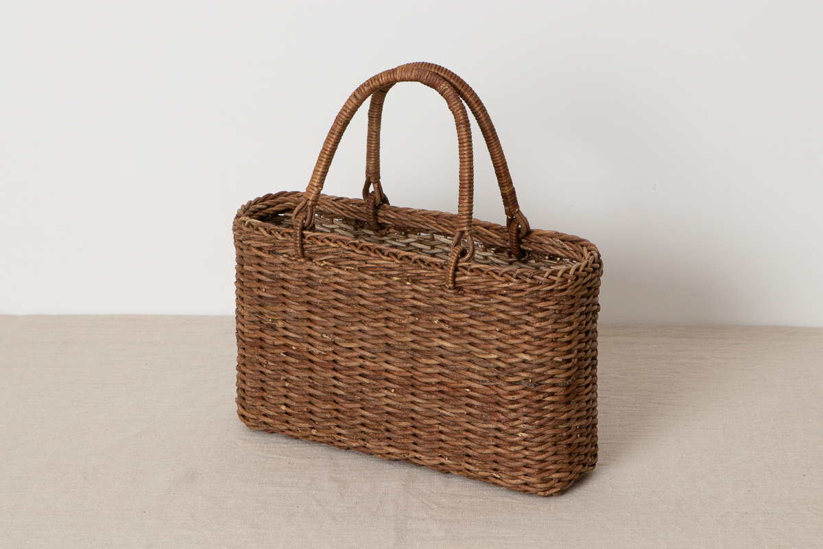 ひごがふんだんに使われ、みっしりと編まれていますが、蔓を半割りにしているため、かごにはそれほどの重さは感じられず、軽やかに持てそうです。