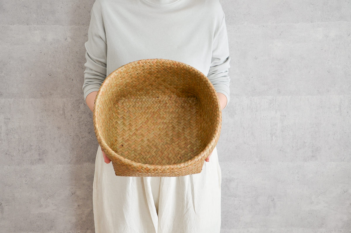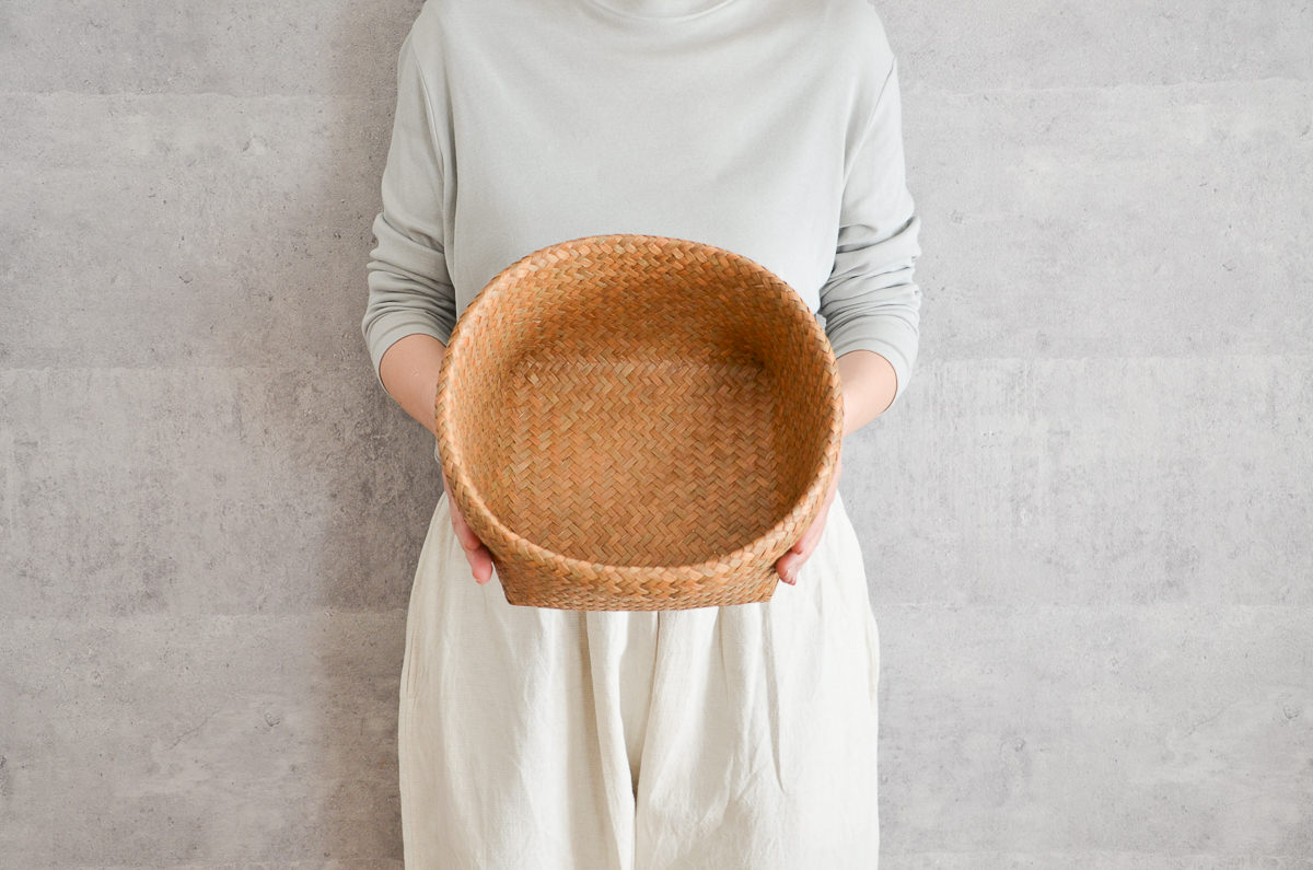 丸い浅型のかごで、中に入れたものが見えやすい形です。